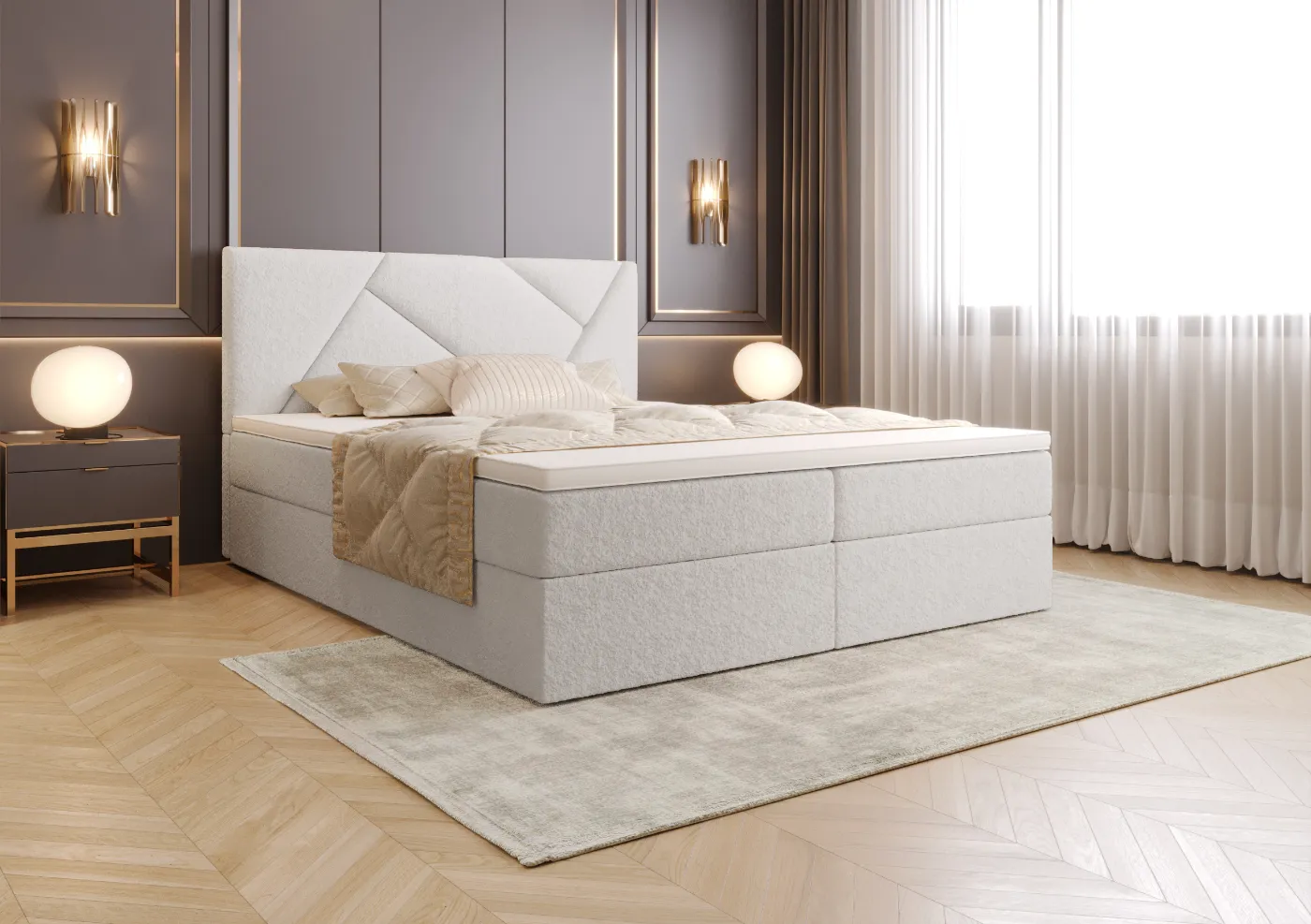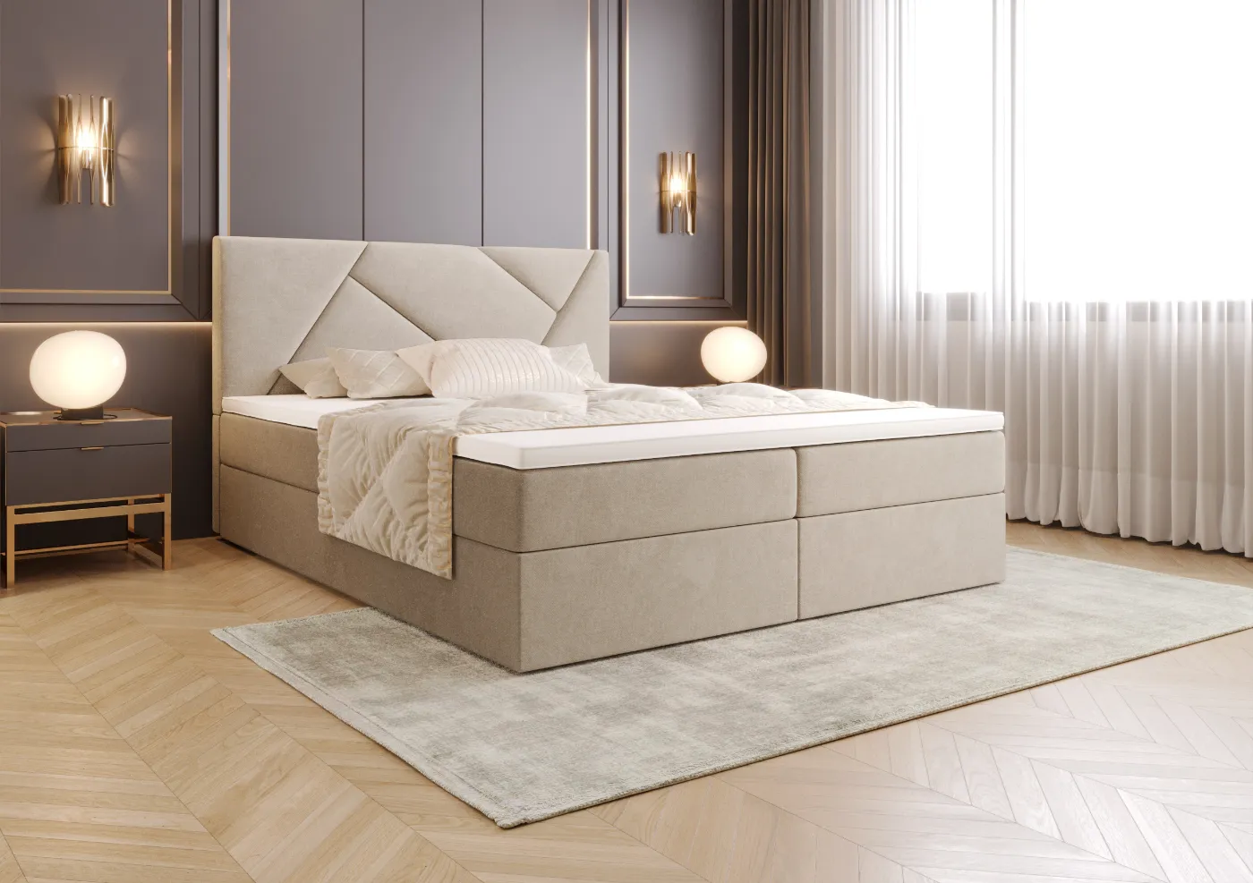 Łóżko Kontynentalne 140x200 TORIA z pojemnikiem i topperem beżowe tkanina welurowa