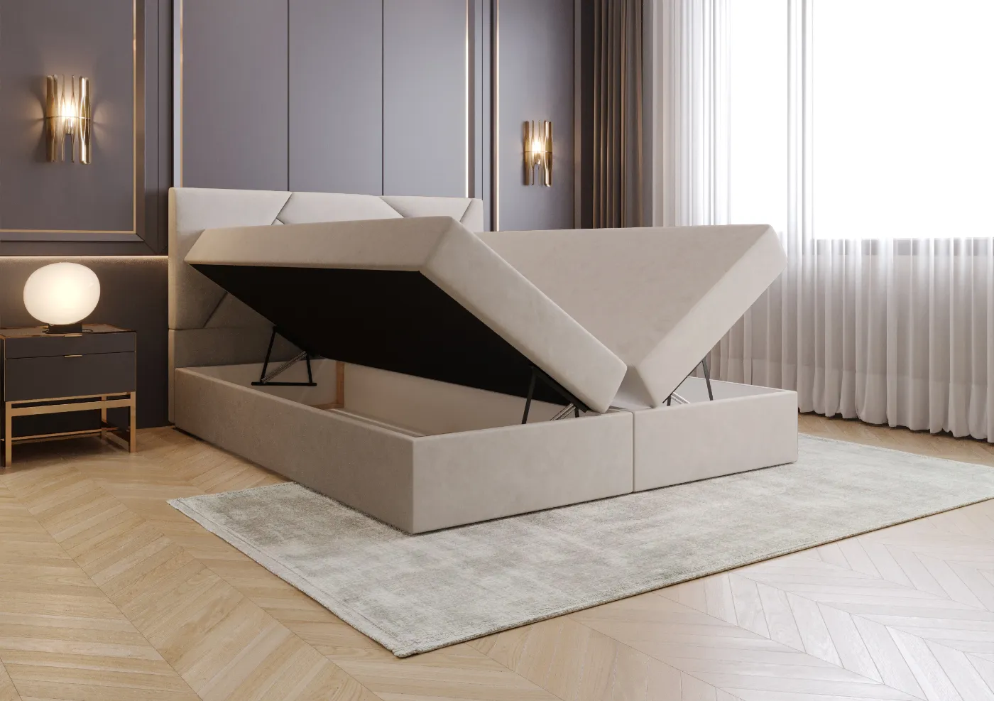 Łóżko Toria wyposażone jest w abstrakcyjny panelowy zagłówek wykonany ręcznie, który zapewnia wygodę podczas czytania i relaksu, a także dodaje elegancji każdemu wnętrzu. Praktyczny pojemnik na pościel to idealne rozwiązanie, które pozwala na optymalne wykorzystanie przestrzeni i utrzymanie porządku w sypialni.