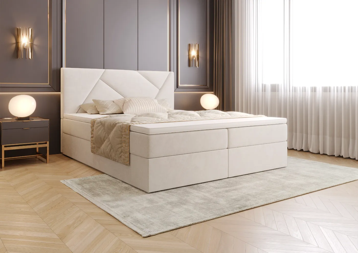 Łóżko Kontynentalne 180x200 TORIA z pojemnikiem i topperem beżowe tkanina welurowa