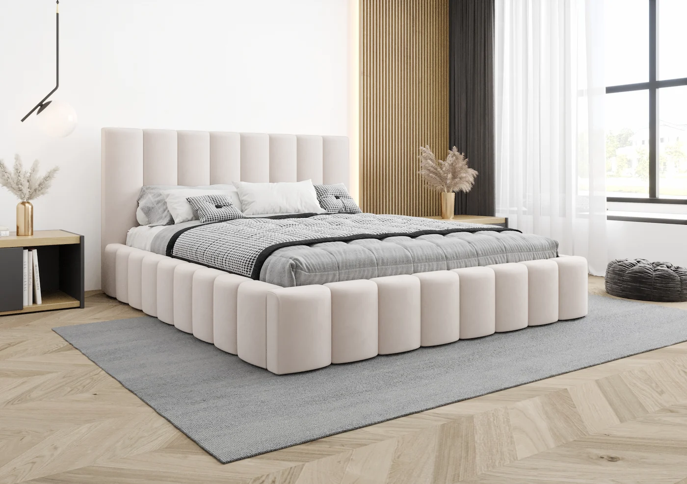 Łóżko wyposażono w praktyczny pojemnik na pościel, który umożliwia wygodne przechowywanie, pomagając utrzymać porządek w sypialni. Co więcej, możesz wybrać pomiędzy stelażem metalowym a drewnianym, co pozwala na idealne dopasowanie łóżka do Twoich potrzeb oraz stylu wnętrza.