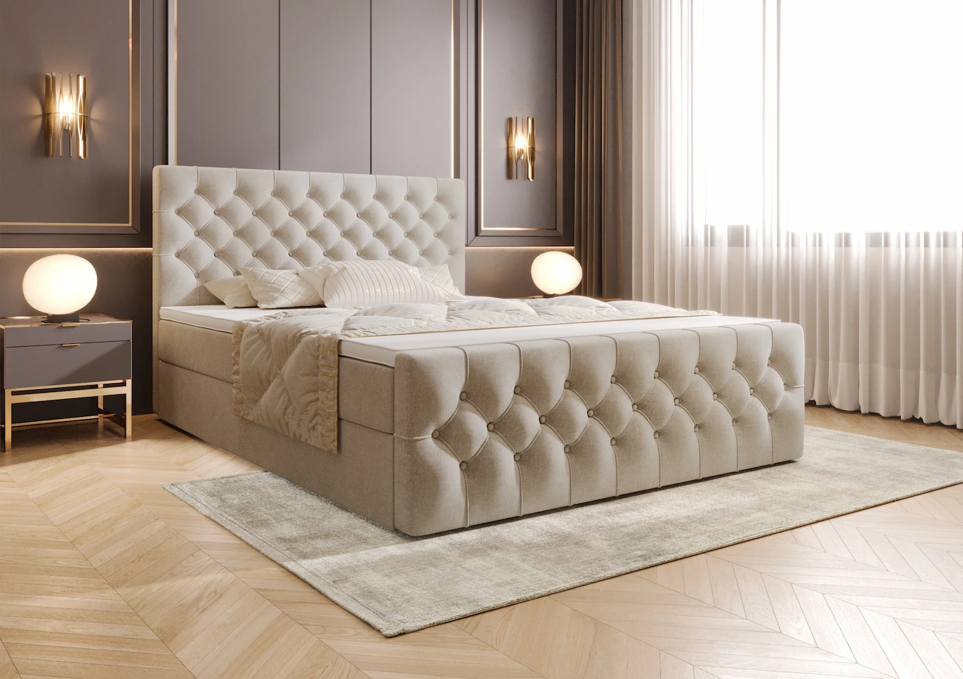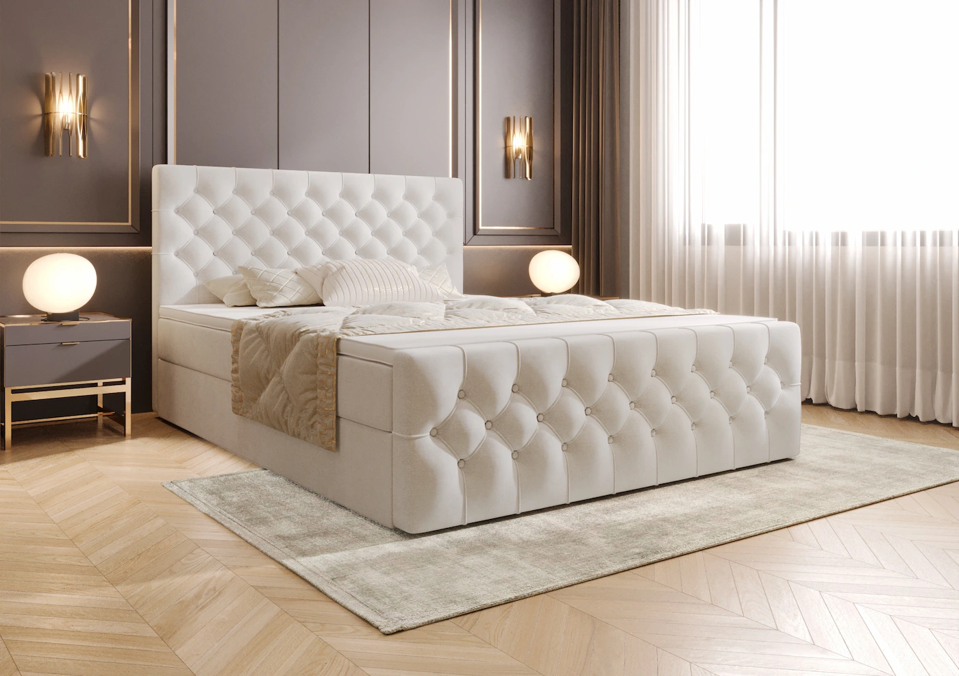 Ręcznie wykonane pikowane zagłowie i przód łóżka to prawdziwe arcydzieło. Starannie zaprojektowane pikowania nadają łóżku niepowtarzalnego charakteru i podkreślają jego elegancję. Wyjątkowy styl zagłówka sprawia, że sypialnia staje się miejscem pełnym wyrafinowania i klasy. Zagłówek nie tylko pięknie się prezentuje, ale również zapewnia wygodne wsparcie podczas wieczornego relaksu czy czytania książek.
