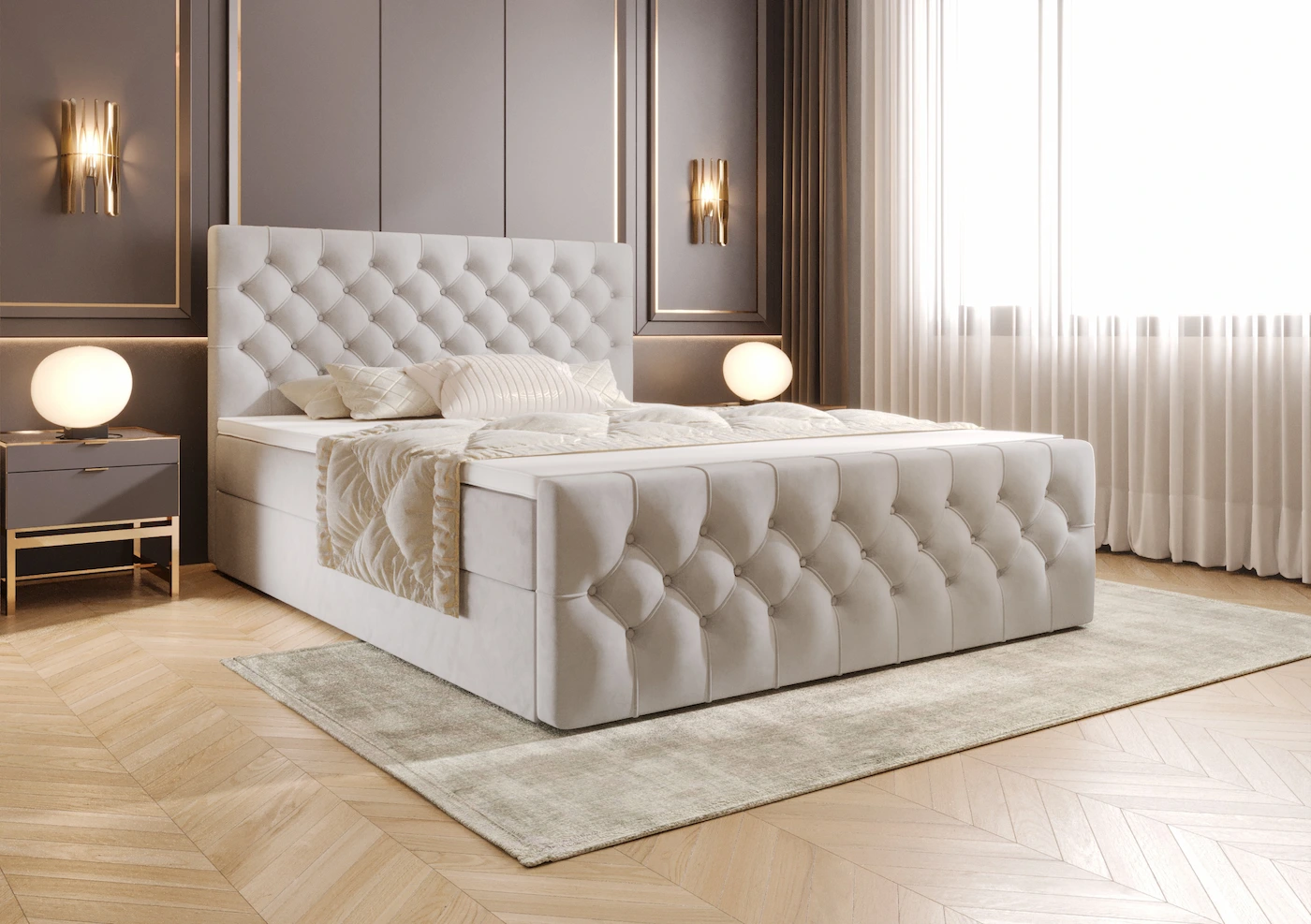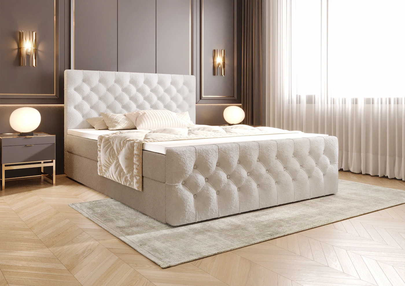 Ręcznie wykonane pikowane zagłowie i przód łóżka to prawdziwe arcydzieło. Starannie zaprojektowane pikowania nadają łóżku niepowtarzalnego charakteru i podkreślają jego elegancję. Wyjątkowy styl zagłówka sprawia, że sypialnia staje się miejscem pełnym wyrafinowania i klasy. Zagłówek nie tylko pięknie się prezentuje, ale również zapewnia wygodne wsparcie podczas wieczornego relaksu czy czytania książek.