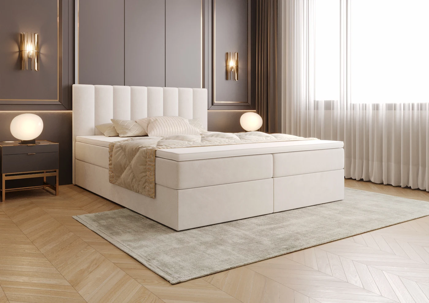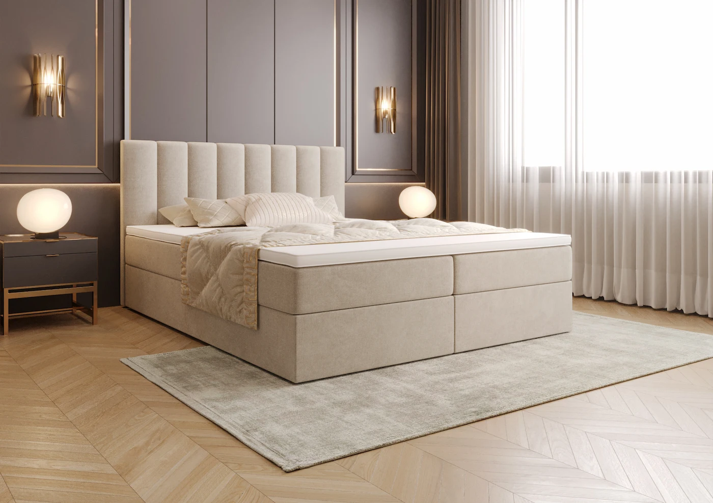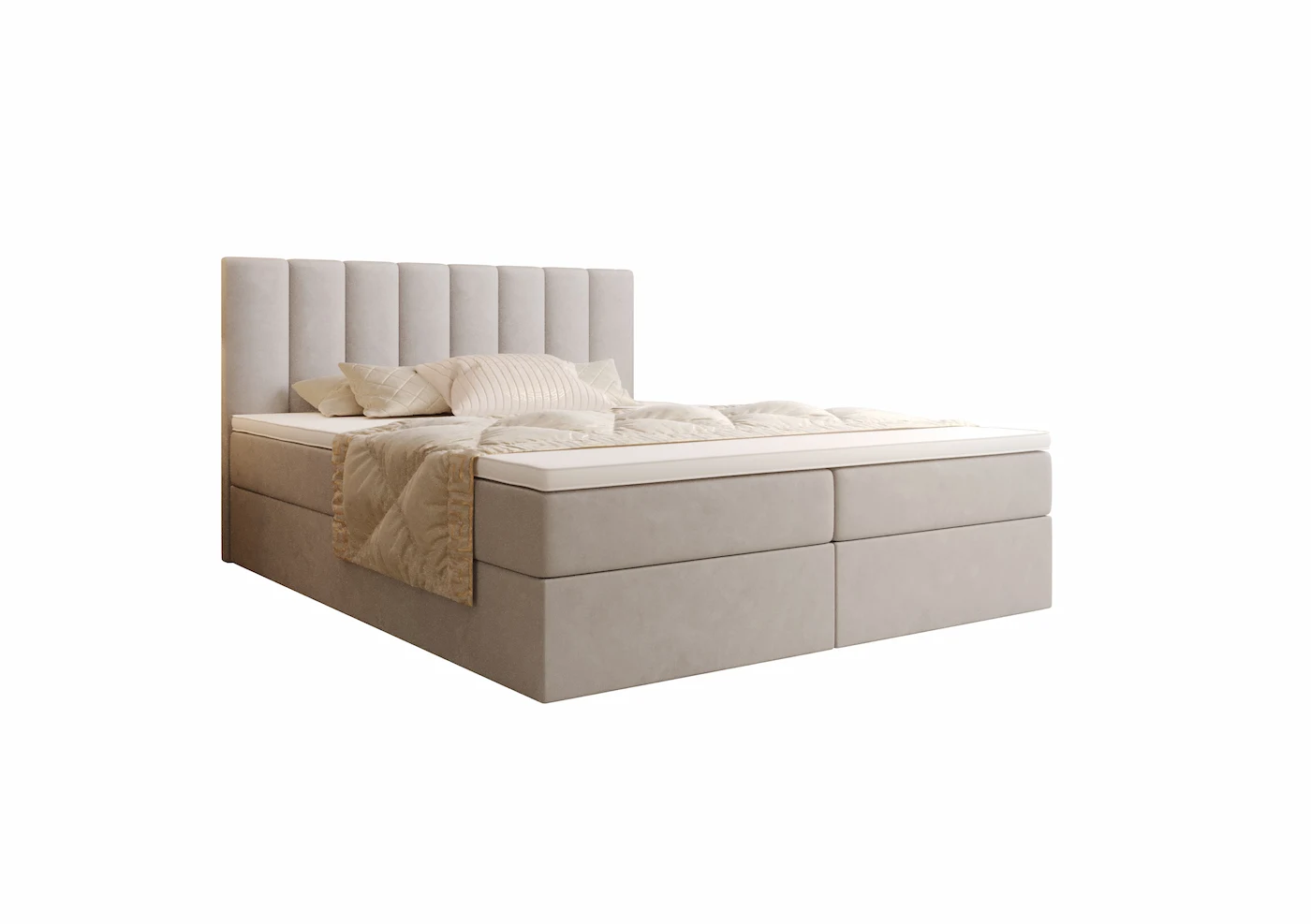 Łóżko kontynentalne 160x200 JENNA z pojemnikiem i topperem beżowe tkanina welurowa