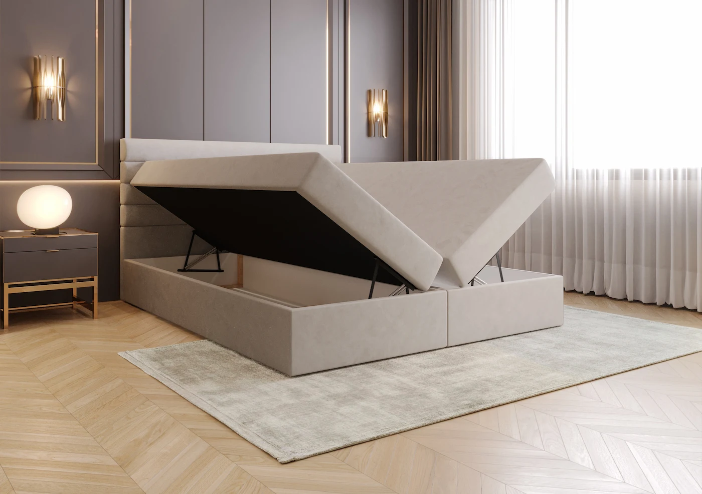 Łóżko kontynentalne 180x200 KIRA z pojemnikiem i topperem beżowe tkanina welurowa