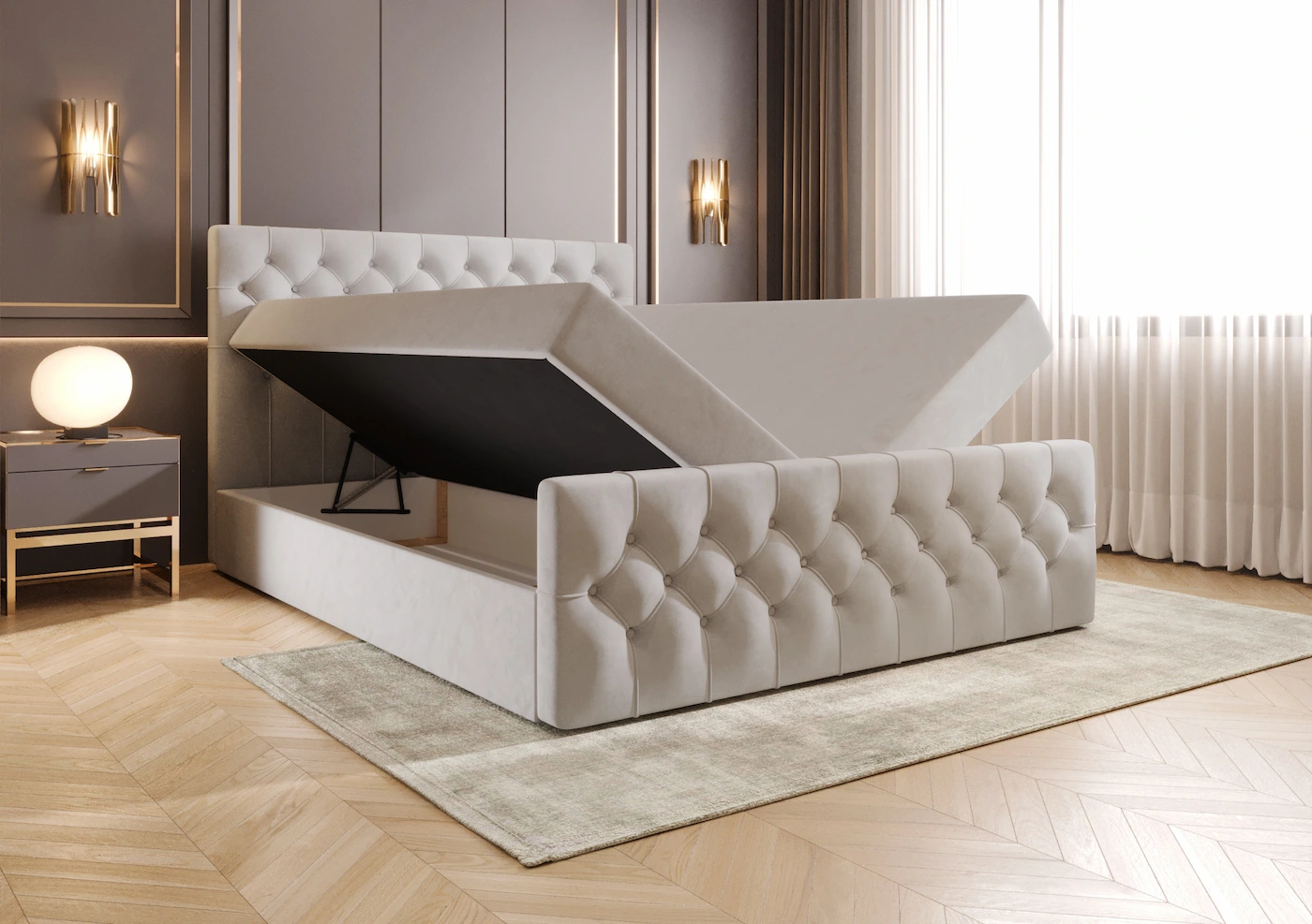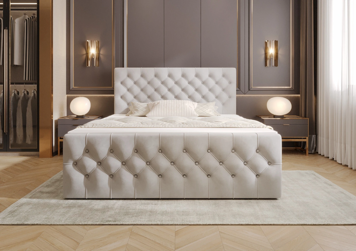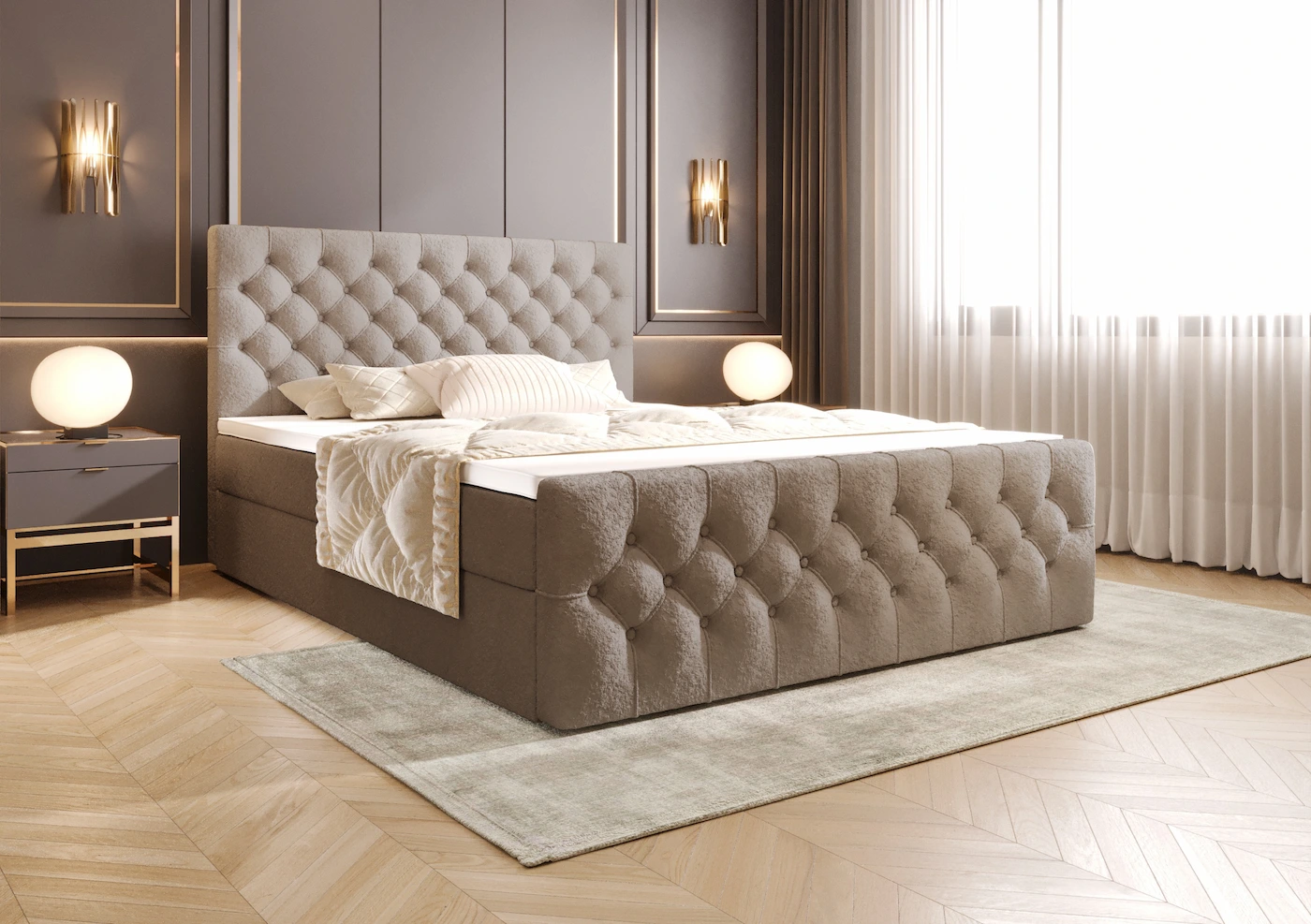 Łóżko kontynentalne 180x200 TESSA z pojemnikiem i topperem beżowe tkanina welurowa