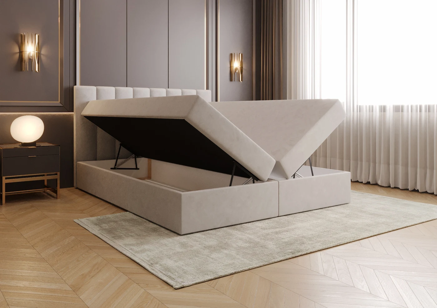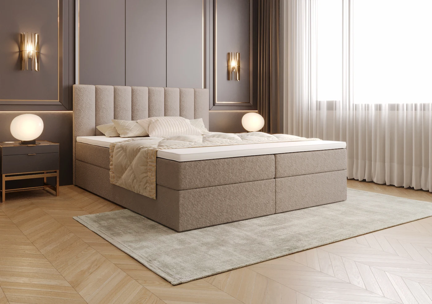 Łóżko kontynentalne 200x200 JENNA z pojemnikiem i topperem beżowe tkanina welurowa