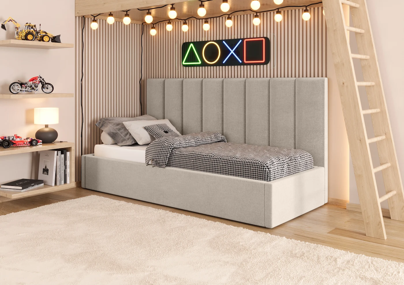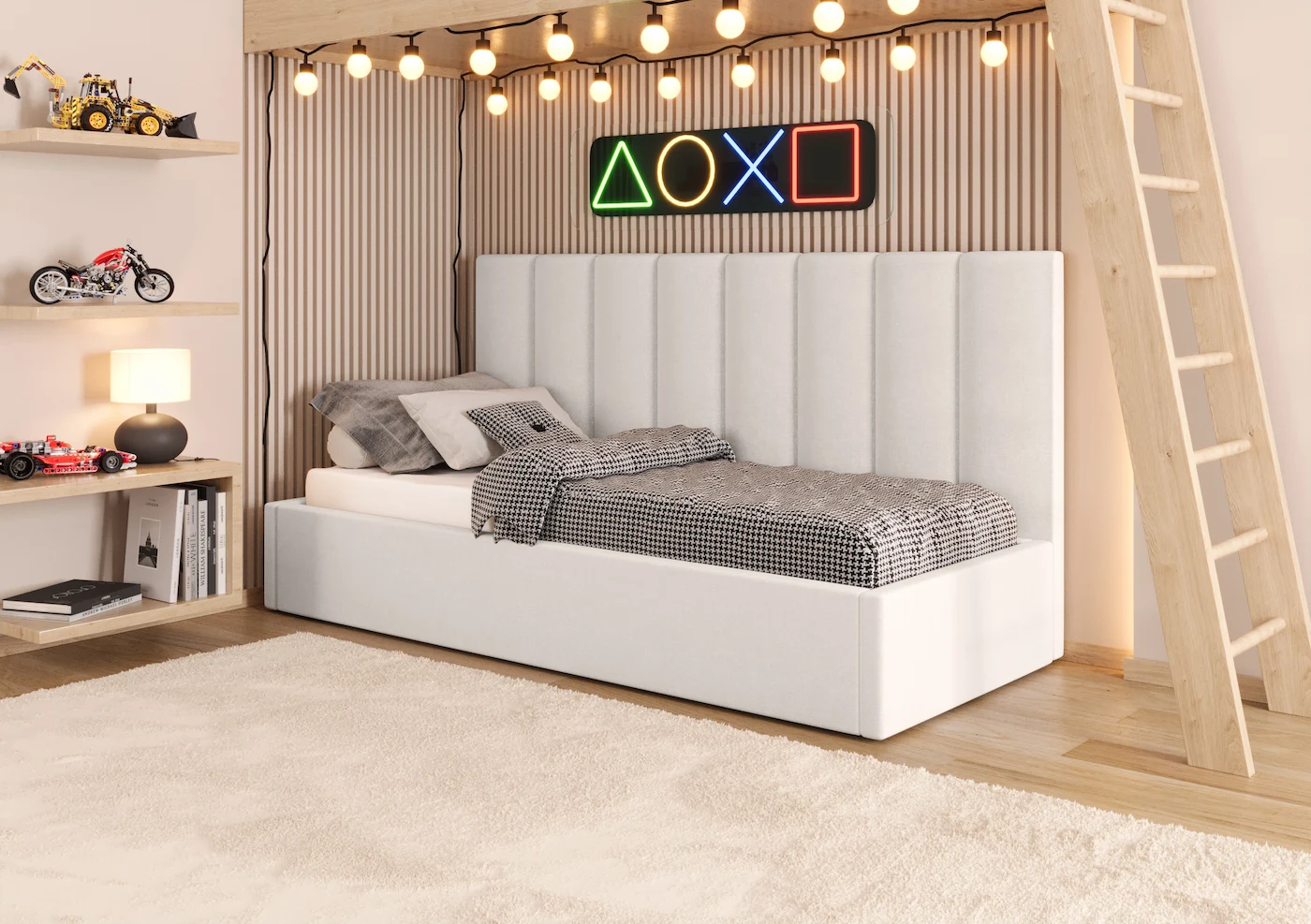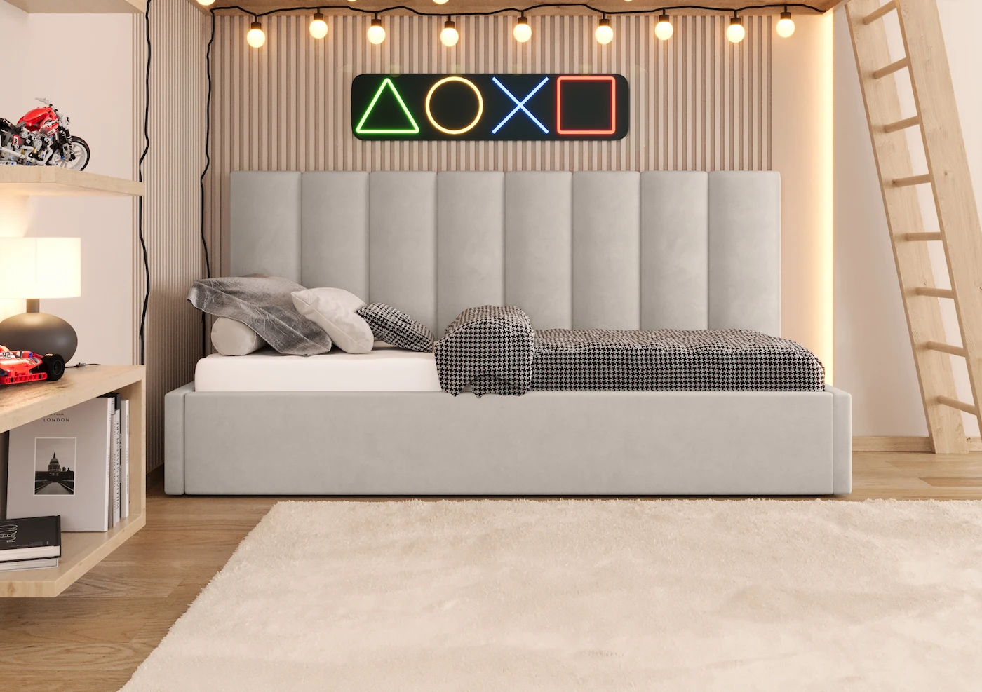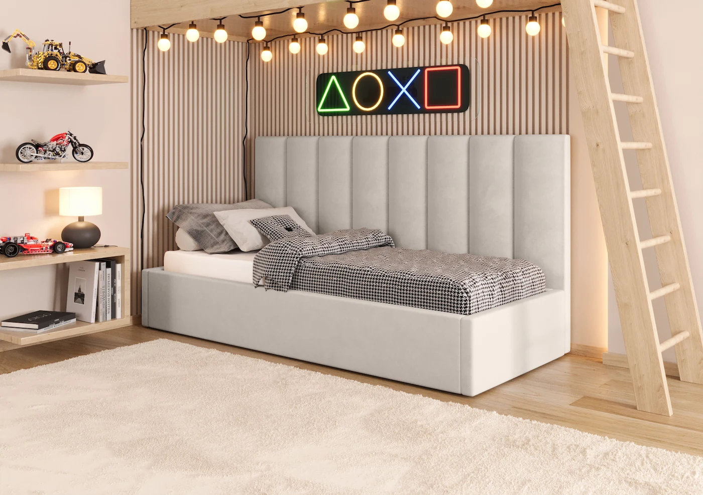 Łóżko Pedro wyróżnia się ręcznie tapicerowanym, wielopanelowym zagłowiem, które nie tylko dodaje charakteru, ale również zapewnia wygodę podczas czytania, nauki czy relaksu. To estetyczny i funkcjonalny detal, który doskonale uzupełnia wnętrze młodzieżowego pokoju, nadając mu nowoczesnego wyglądu.