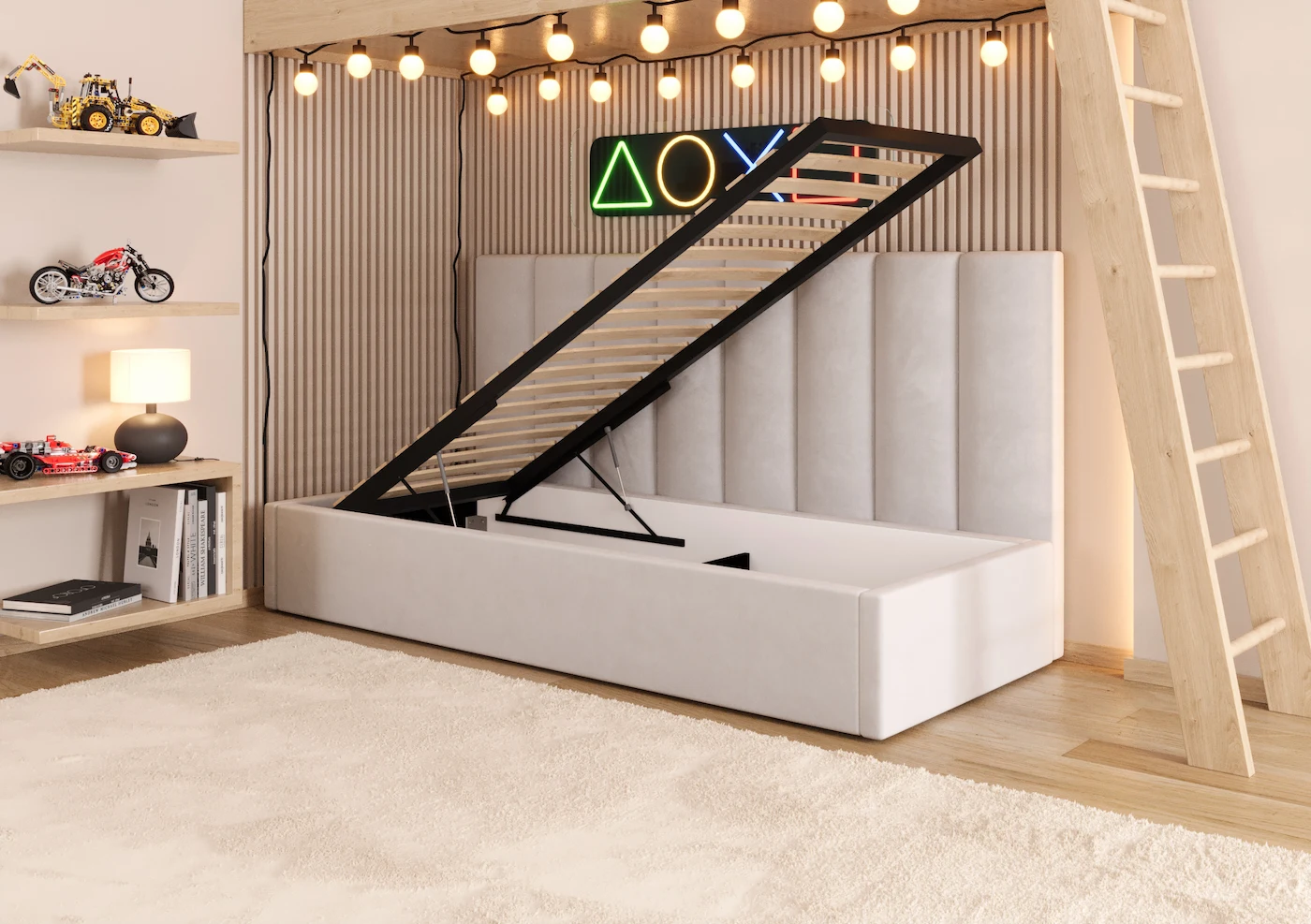 Łóżko może zostać wyposażone w praktyczny pojemnik na pościel, który pozwala na łatwą organizację przestrzeni w pokoju – schowasz w nim nie tylko kołdrę i poduszki, ale również inne drobiazgi. Solidny stelaż oraz wytrzymała konstrukcja zapewniają trwałość i bezpieczeństwo użytkowania przez wiele lat.