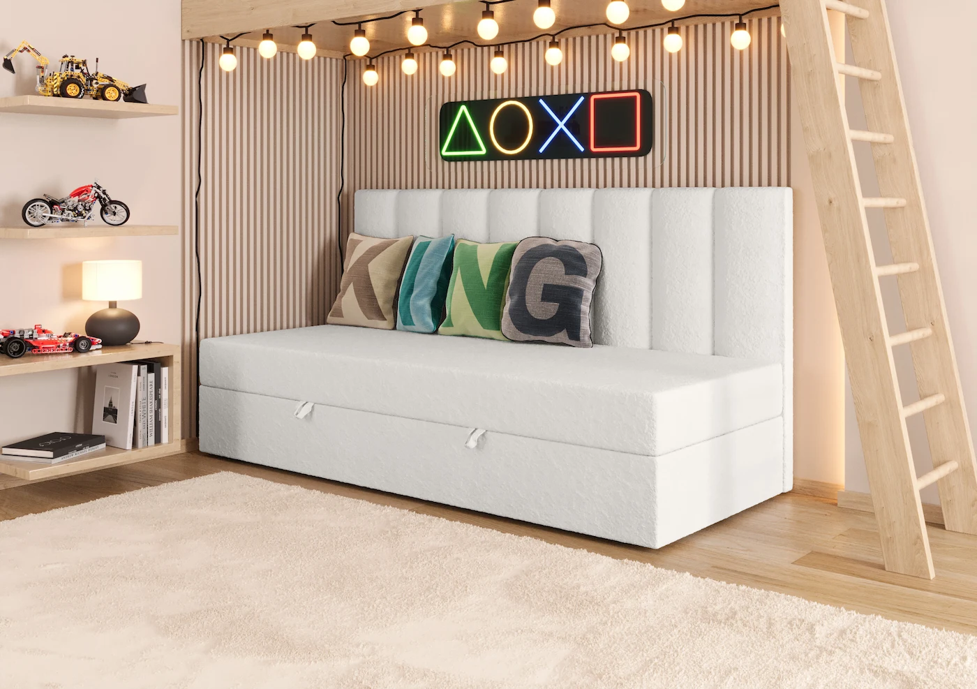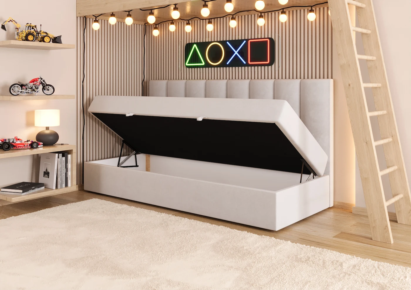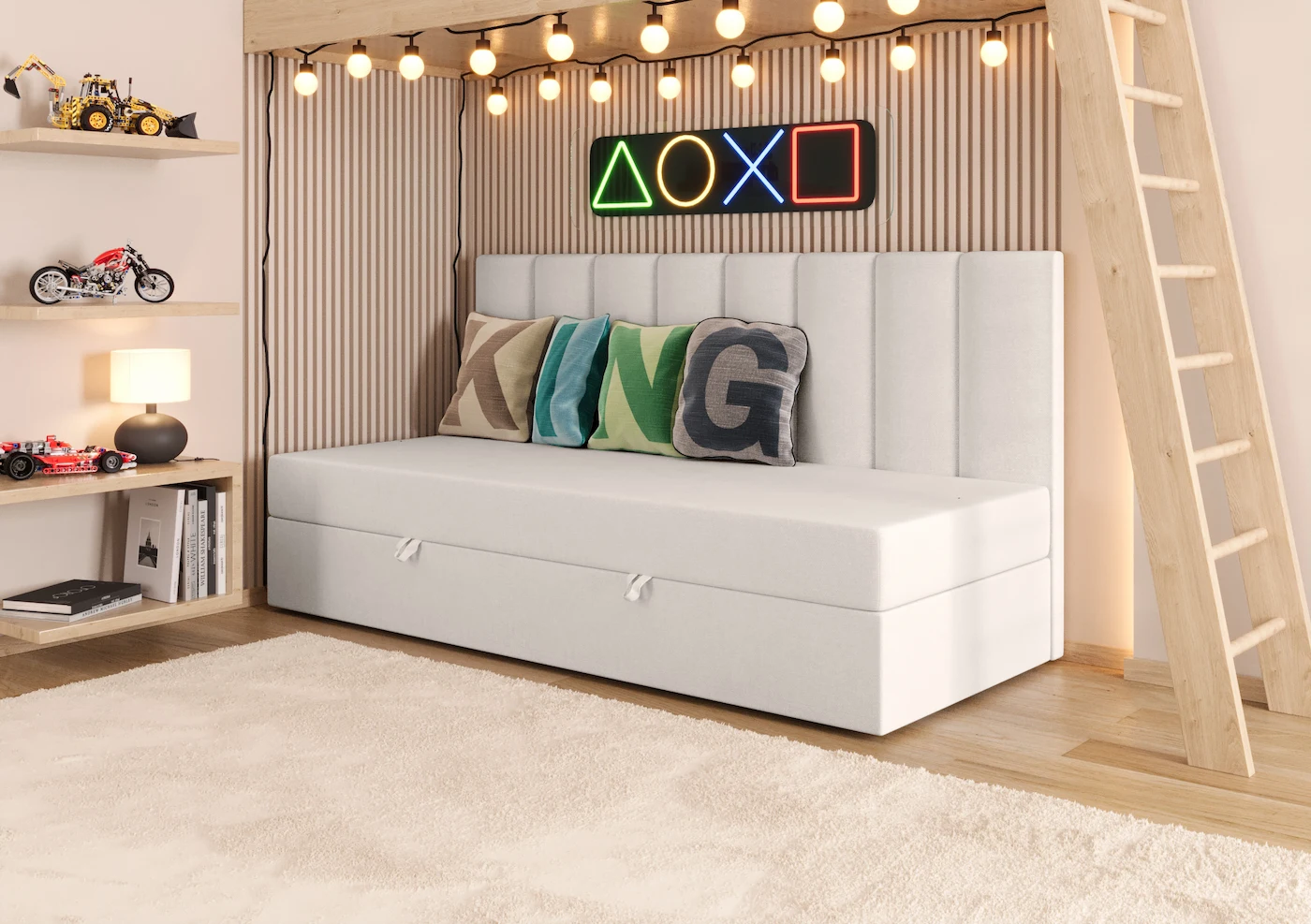 Pojemnik na pościel to praktyczne rozwiązanie, które pomoże w organizacji pokoju – pomieści nie tylko pościel, ale także ulubione zabawki, książki lub inne przedmioty, na które młodzież potrzebuje dodatkowego miejsca. Solidna konstrukcja zapewnia wytrzymałość, a wygodny, tapicerowany zagłówek gwarantuje komfort przy czytaniu lub spędzaniu czasu z przyjaciółmi.