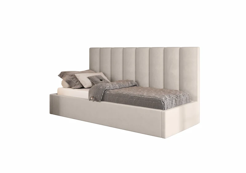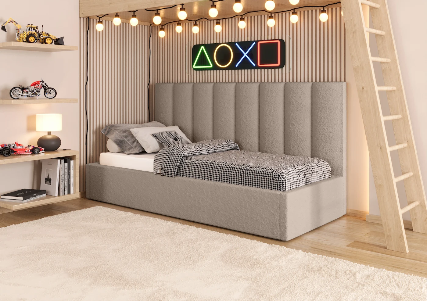 Łóżko Pedro wyróżnia się ręcznie tapicerowanym, wielopanelowym zagłowiem, które nie tylko dodaje charakteru, ale również zapewnia wygodę podczas czytania, nauki czy relaksu. To estetyczny i funkcjonalny detal, który doskonale uzupełnia wnętrze młodzieżowego pokoju, nadając mu nowoczesnego wyglądu.