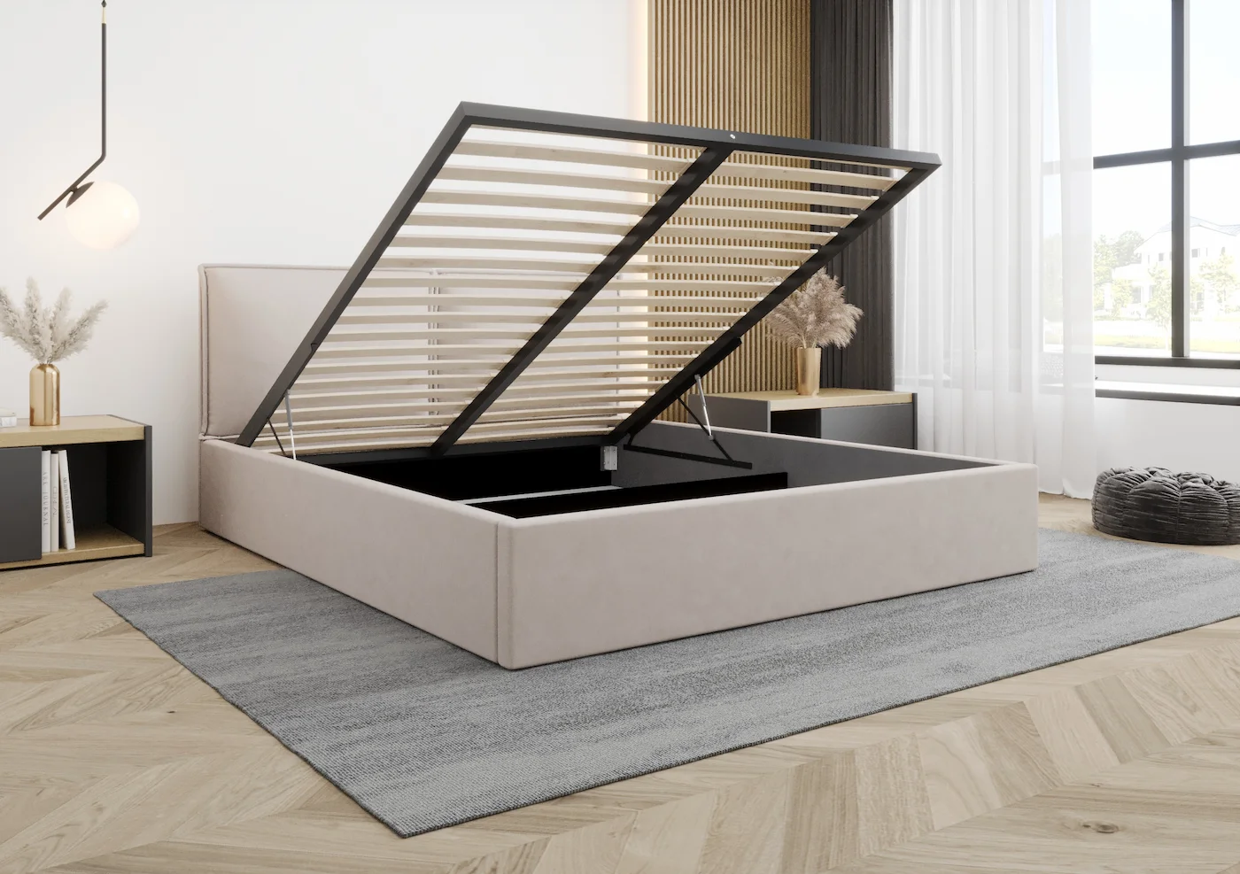 Łóżko zostało wyposażone w praktyczny pojemnik na pościel, który pomoże utrzymać porządek i maksymalnie wykorzystać przestrzeń. Możesz także dopasować stelaż do swoich potrzeb, wybierając pomiędzy metalowym a drewnianym, co gwarantuje trwałość i komfort użytkowania przez długie lata.