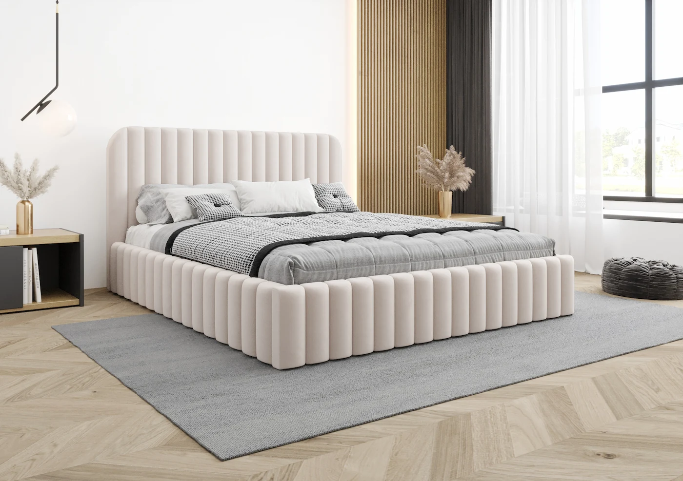 Łóżko tapicerowane 140x200 ENRICO z pojemnikiem i stelażem beżowe tkanina welurowa