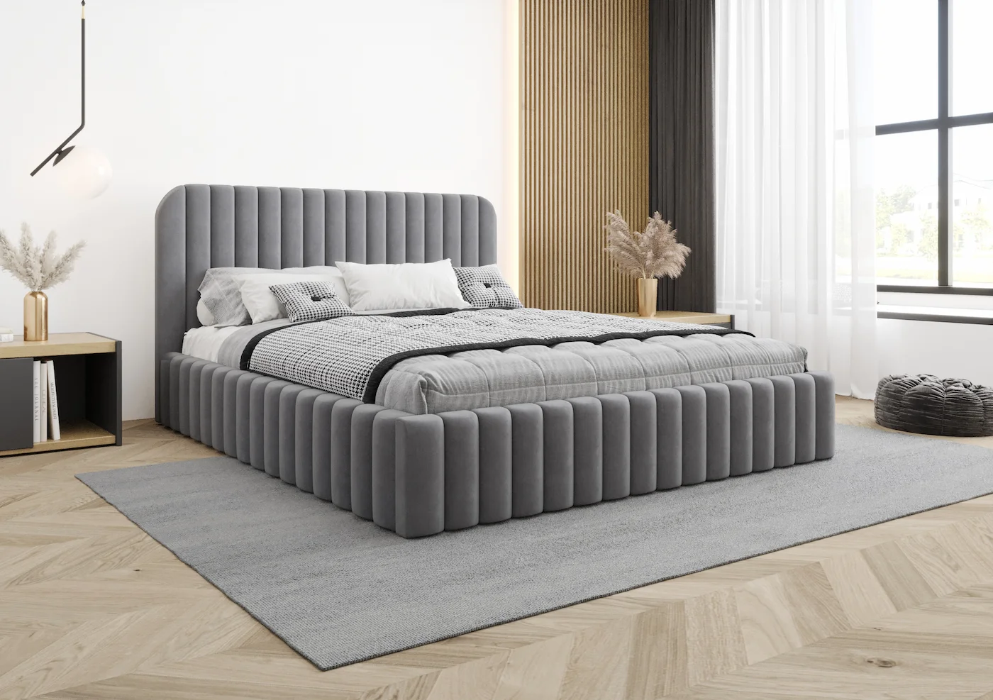 Najbardziej charakterystycznym elementem łóżka Lambi jest wielopanelowy, tapicerowany zagłówek, który łączy styl z wygodą. Zapewnia on komfortowe oparcie podczas wieczornego relaksu i stanowi elegancką ozdobę sypialni. Tapicerowane boki i przód łóżka dodatkowo podkreślają jego nowoczesny charakter, tworząc spójny i wyrafinowany design.