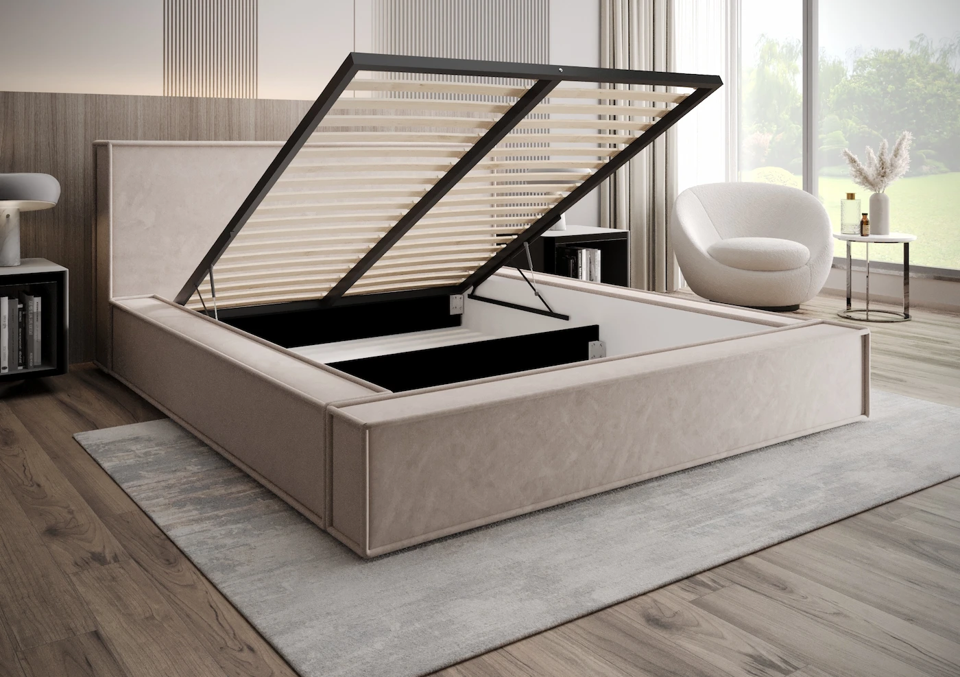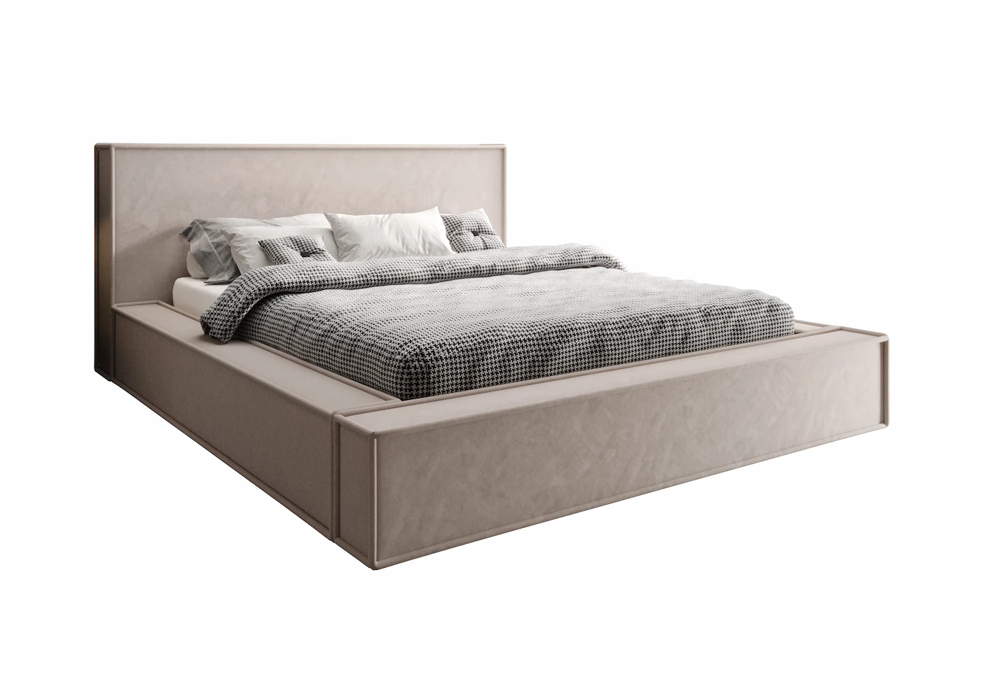 Łóżko tapicerowane 140x200 FONDI z pojemnikiem i stelażem beżowe tkanina welurowa