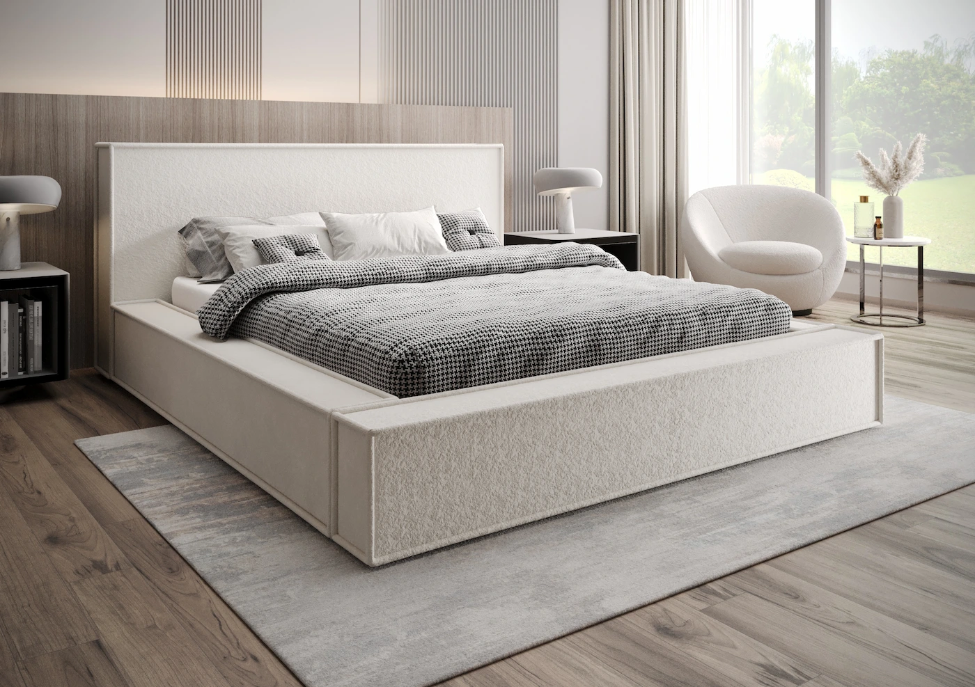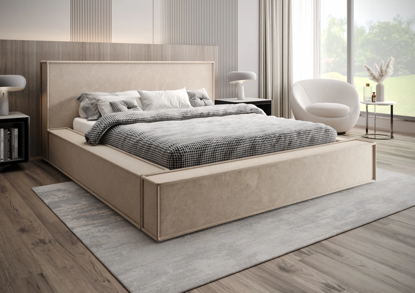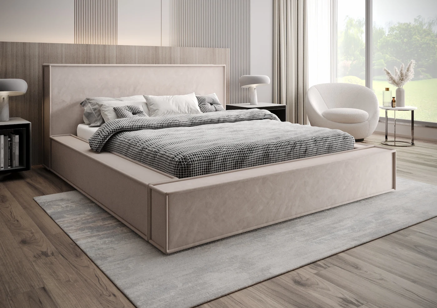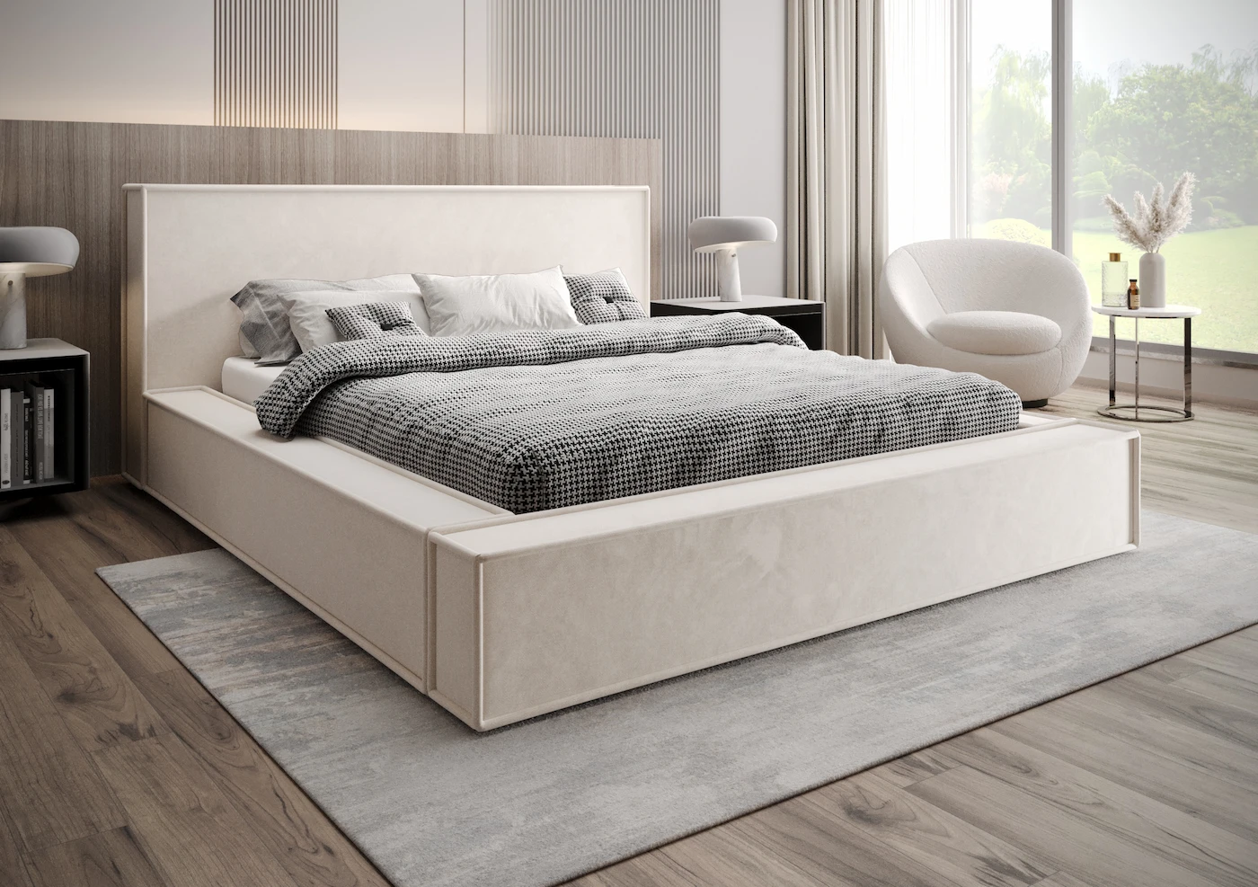 - Zagłówek i rama: Masywna konstrukcja z delikatnym obszyciem