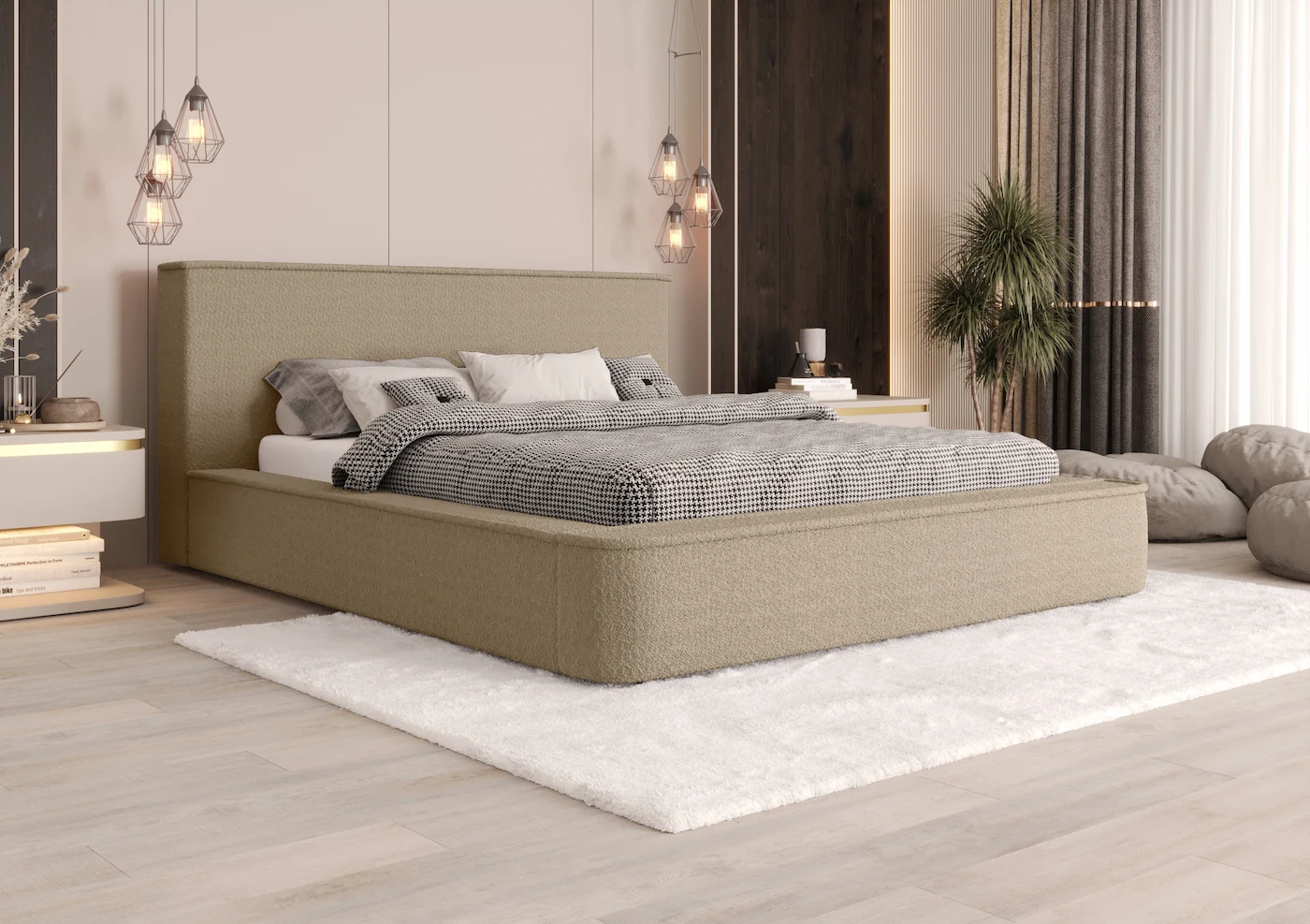 Łóżko tapicerowane 140x200 HOMMIE z pojemnikiem i stelażem beżowe tkanina welurowa