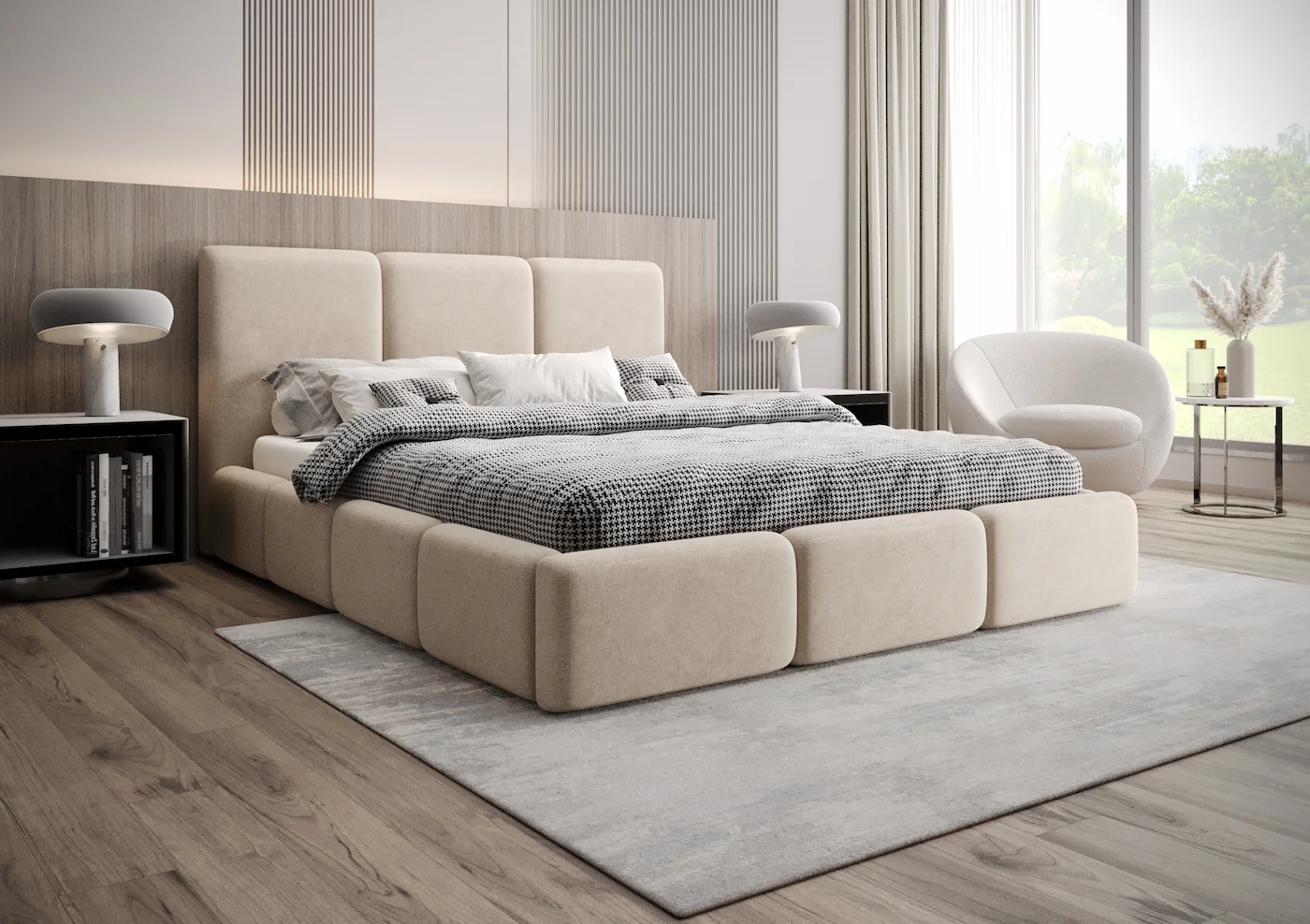 Najbardziej charakterystycznym elementem tego łóżka jest jego trzypanelowy, tapicerowany zagłówek, który nie tylko dodaje klasy i stylu, ale także zapewnia wygodne oparcie podczas wieczornego odpoczynku. Trzypanelowy przód łóżkaharmonijnie dopełnia całość, nadając meblowi spójny i nowoczesny wygląd.
