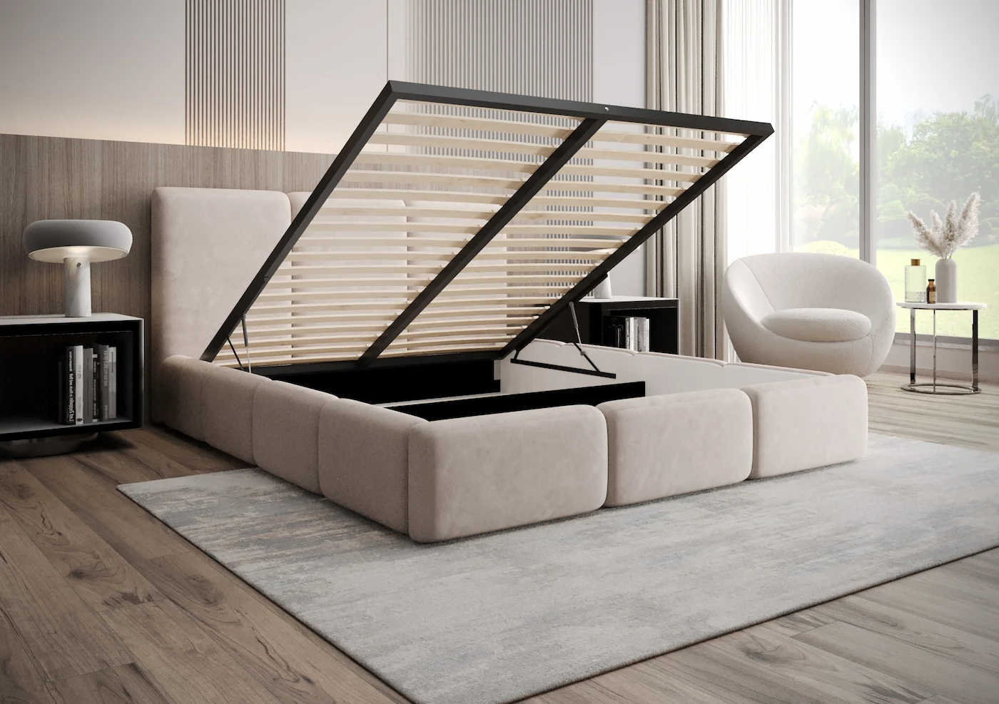 Łóżko Monaco jest także niezwykle praktyczne – zostało wyposażone w pojemnik na pościel, który pomoże Ci utrzymać porządek w sypialni. Dzięki temu z łatwością przechowasz dodatkowe kołdry, poduszki czy inne tekstylia, oszczędzając przestrzeń w pomieszczeniu.