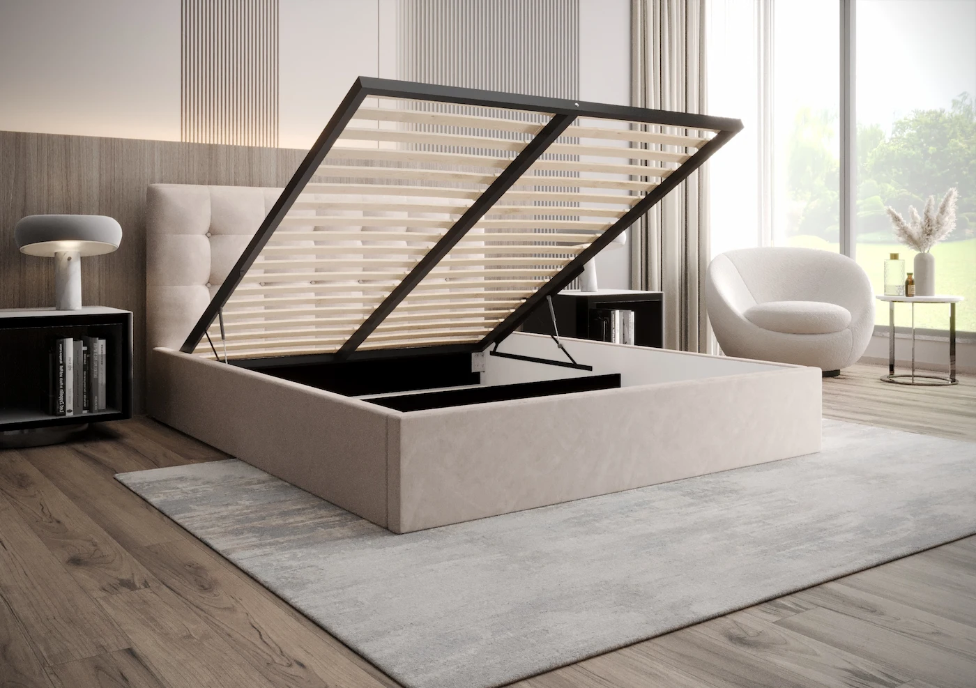 Łóżko Naomi zostało wyposażone w praktyczny pojemnik na pościel, który pozwala łatwo przechowywać kołdry, poduszki czy inne tekstylia, utrzymując porządek w sypialni.