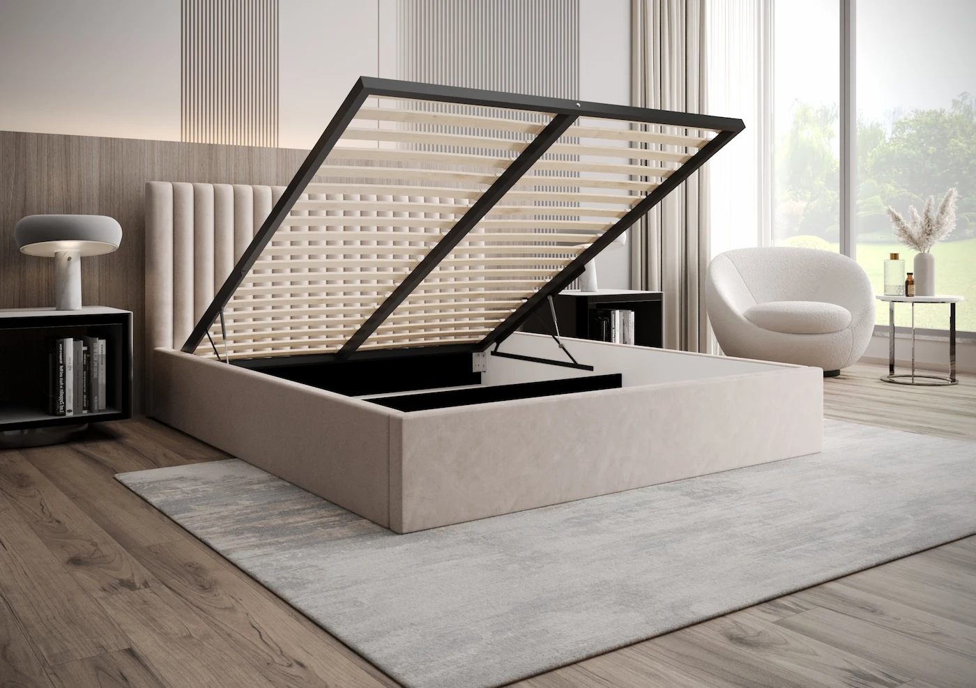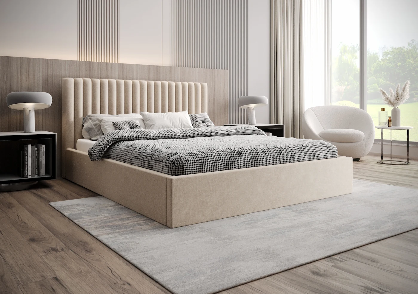 Łóżko tapicerowane 140x200 OHIO z pojemnikiem i stelażem beżowe tkanina welurowa
