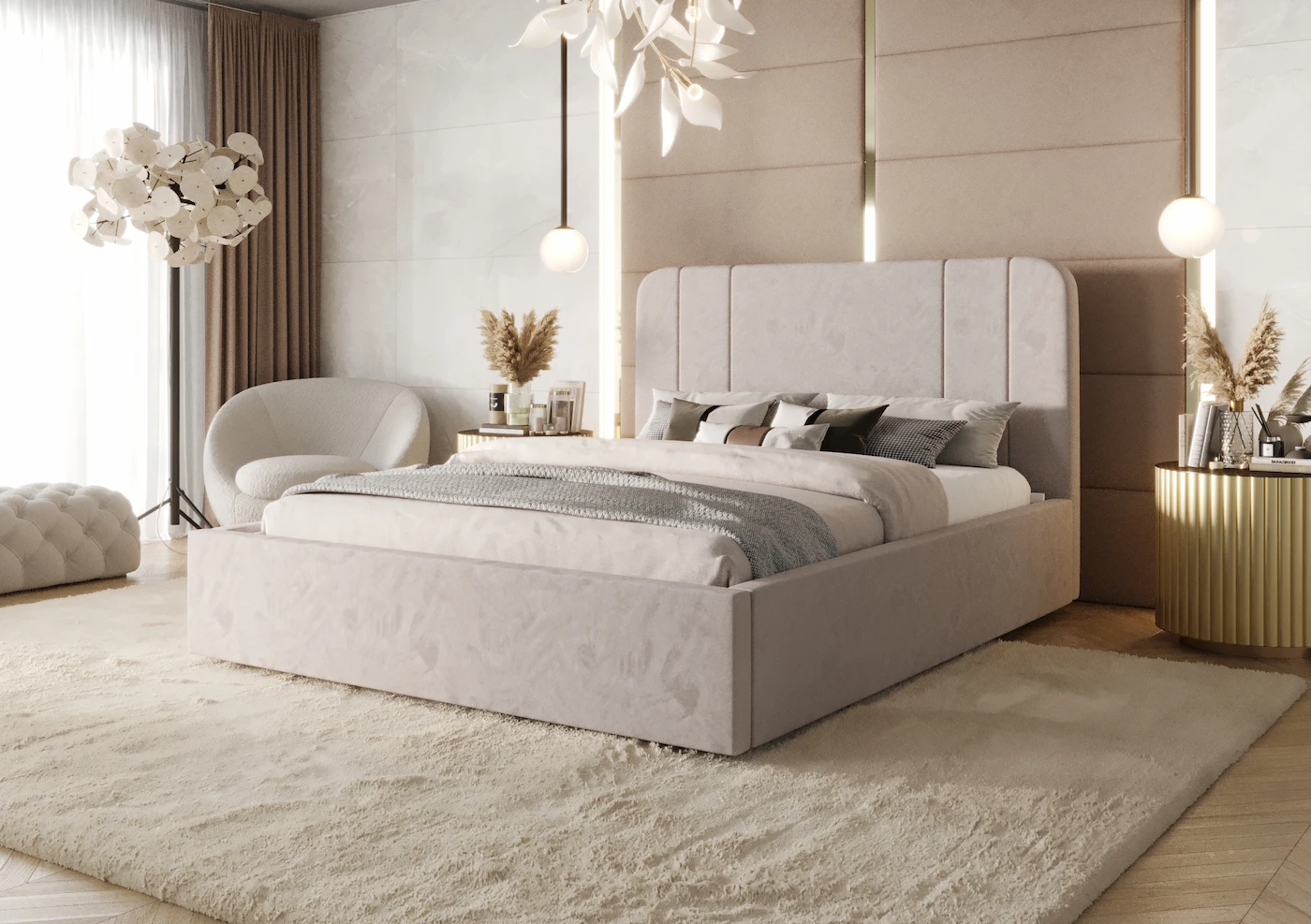 Łóżko tapicerowane 140x200 RITA z pojemnikiem i stelażem beżowe tkanina welurowa