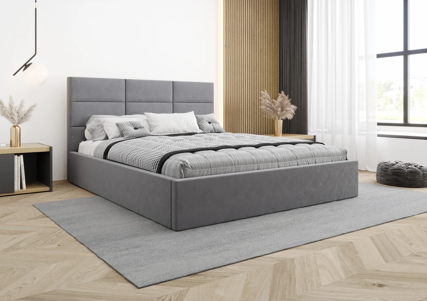 Najbardziej wyróżniającym elementem łóżka Sydney jest jego tapicerowany, dziewięciopanelowy zagłówek, który dodaje wnętrzu elegancji i luksusu. Precyzyjne wykończenie i ręczne wykonanie zapewniają unikalność każdego egzemplarza. Zagłówek nie tylko stanowi atrakcyjny akcent dekoracyjny, ale także gwarantuje wygodne oparciepodczas czytania czy relaksu.