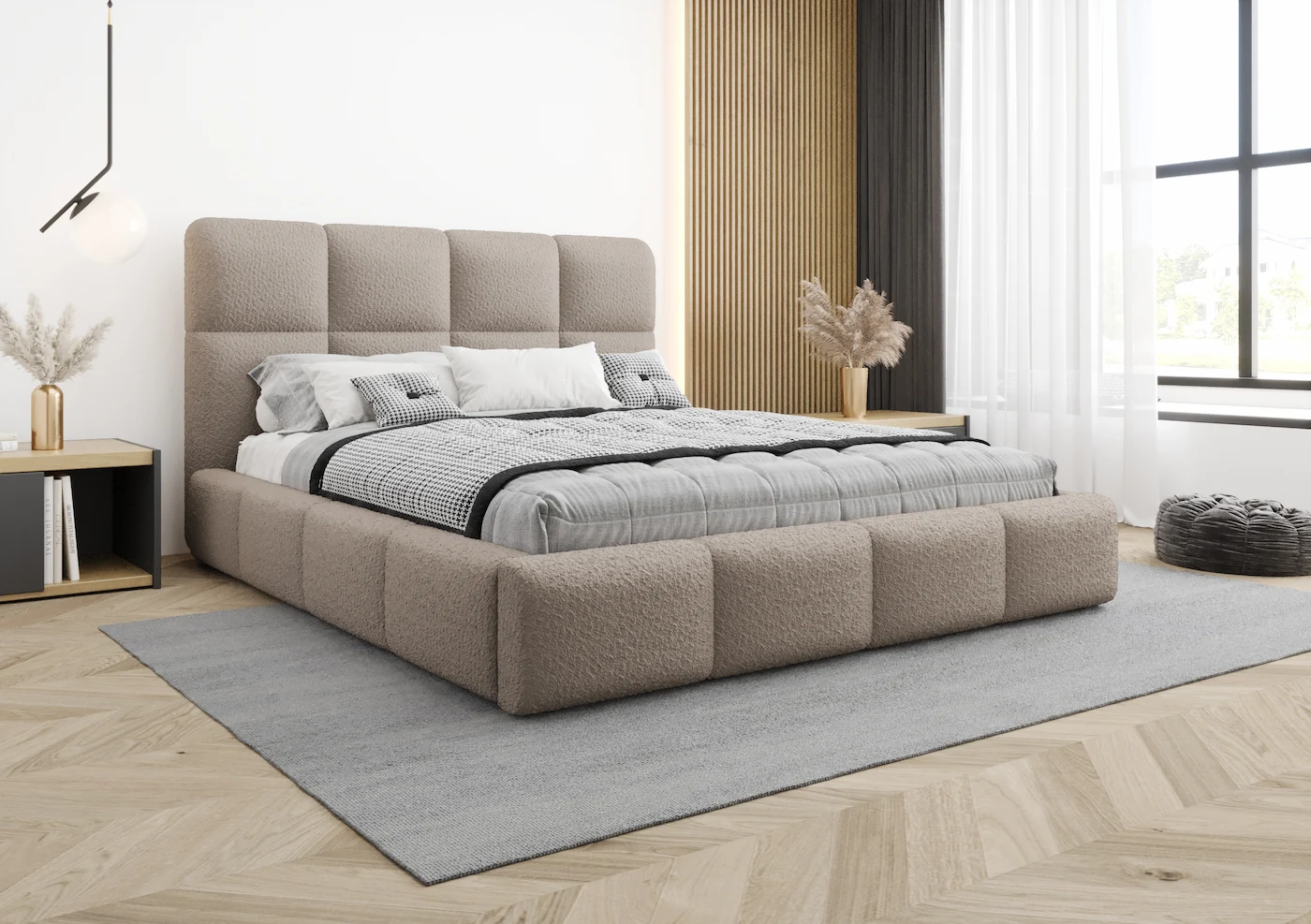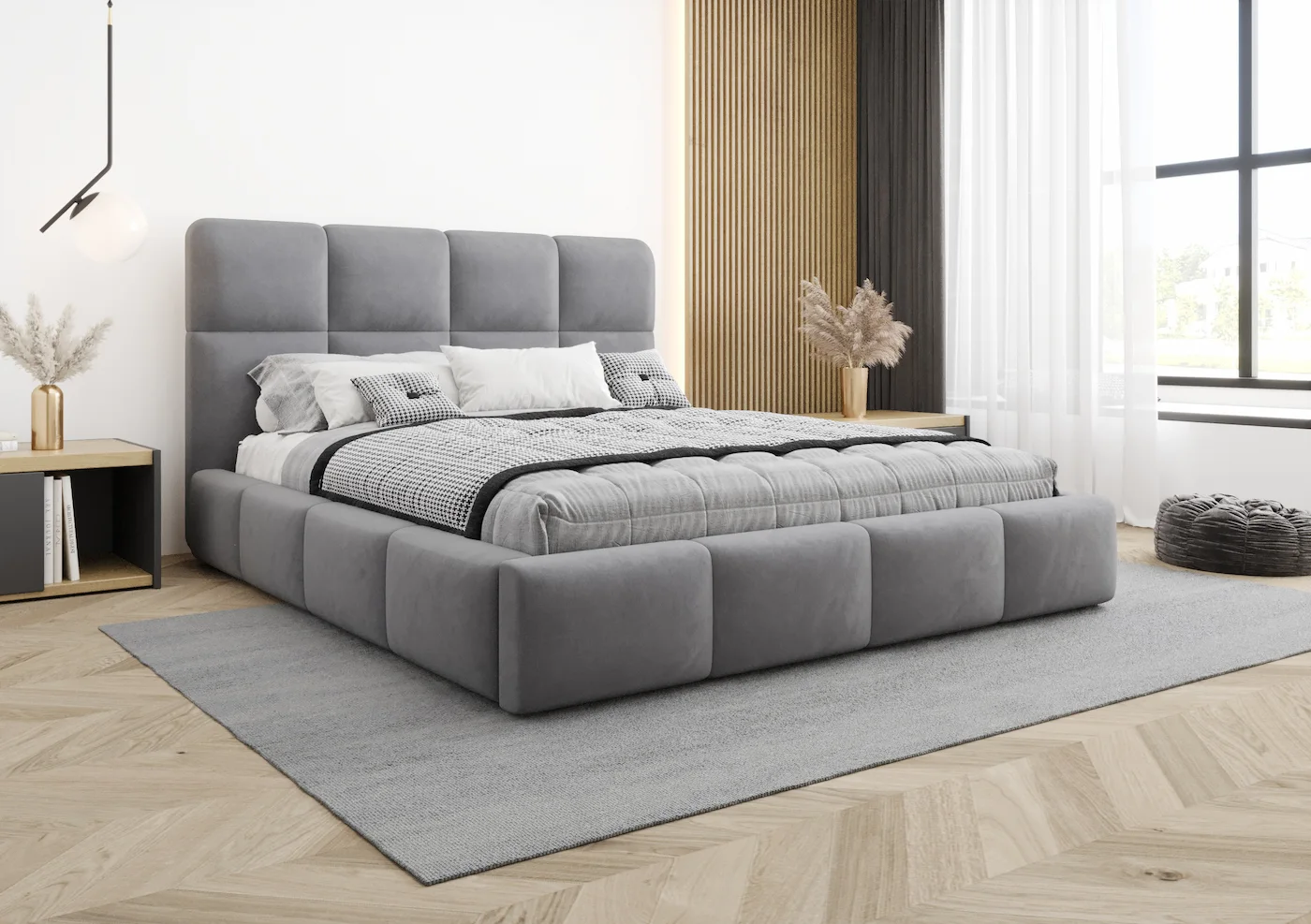 Najbardziej charakterystycznym elementem łóżka Angel jest tapicerowany wielopanelowy zagłówek, który otula ramę łóżka i nadaje mu wyjątkowego stylu. Zagłówek został wykonany ręcznie, dzięki czemu każdy egzemplarz wyróżnia się indywidualnym charakterem. Miękka, puszysta forma nie tylko dodaje przytulności, ale również zapewnia doskonałe podparcie podczas odpoczynku, czytania książki lub oglądania telewizji.