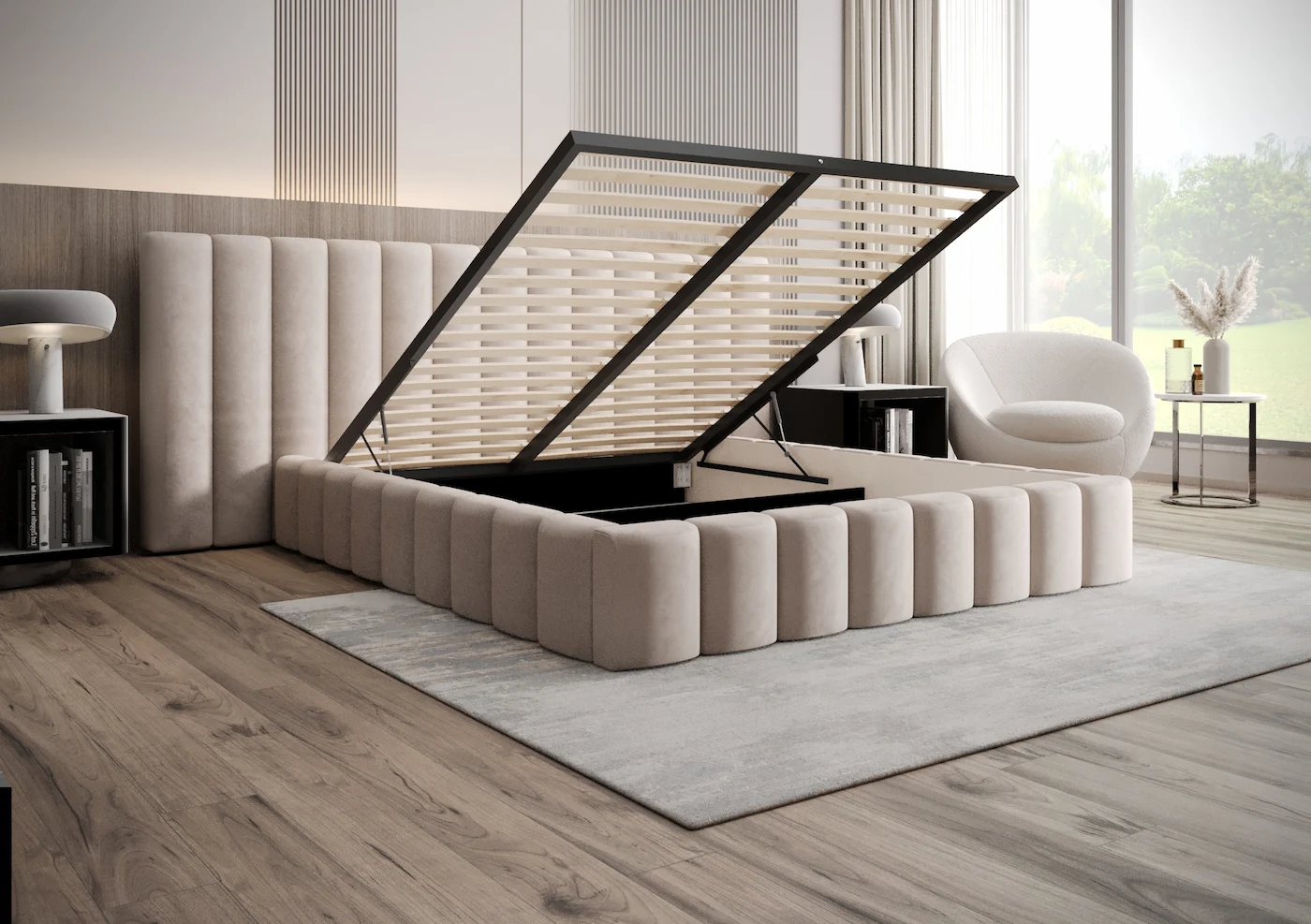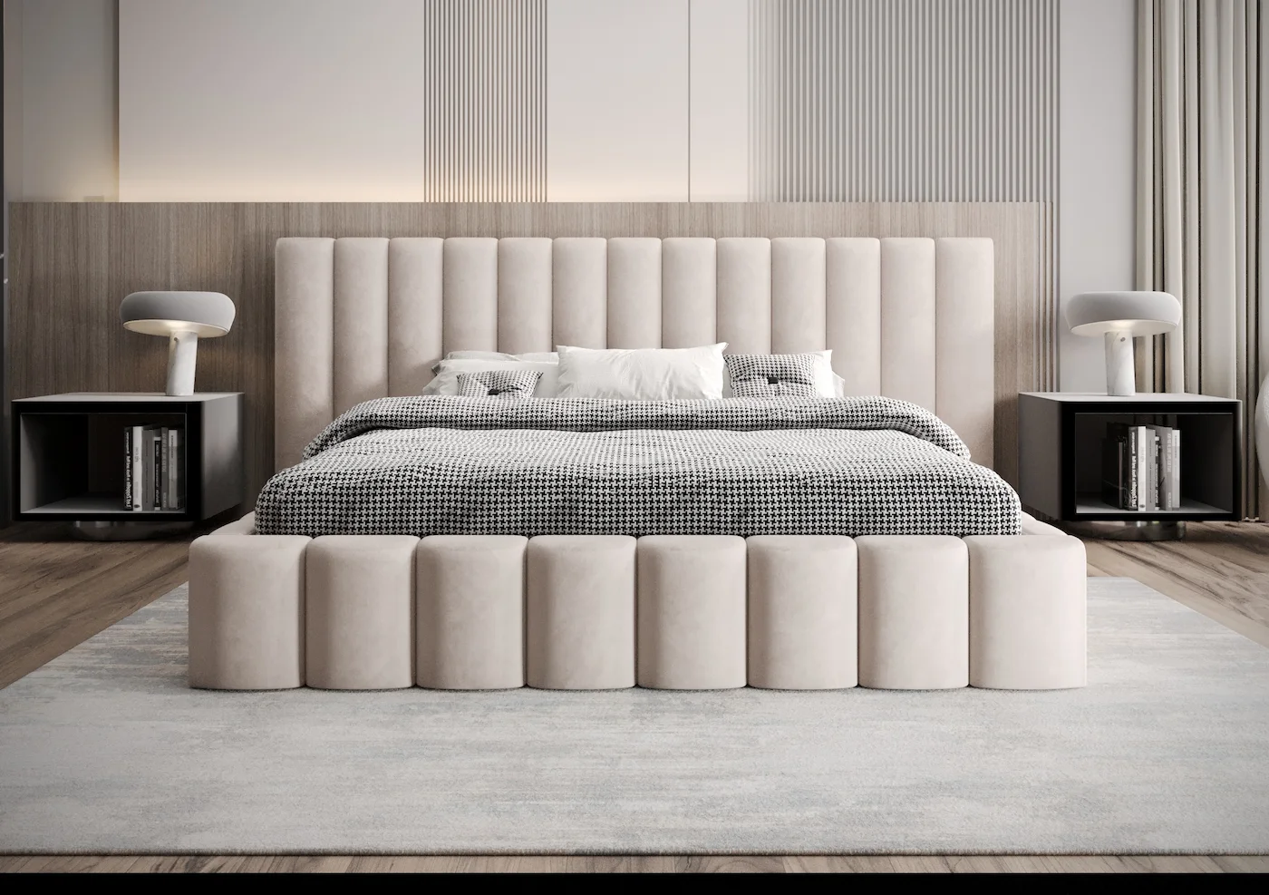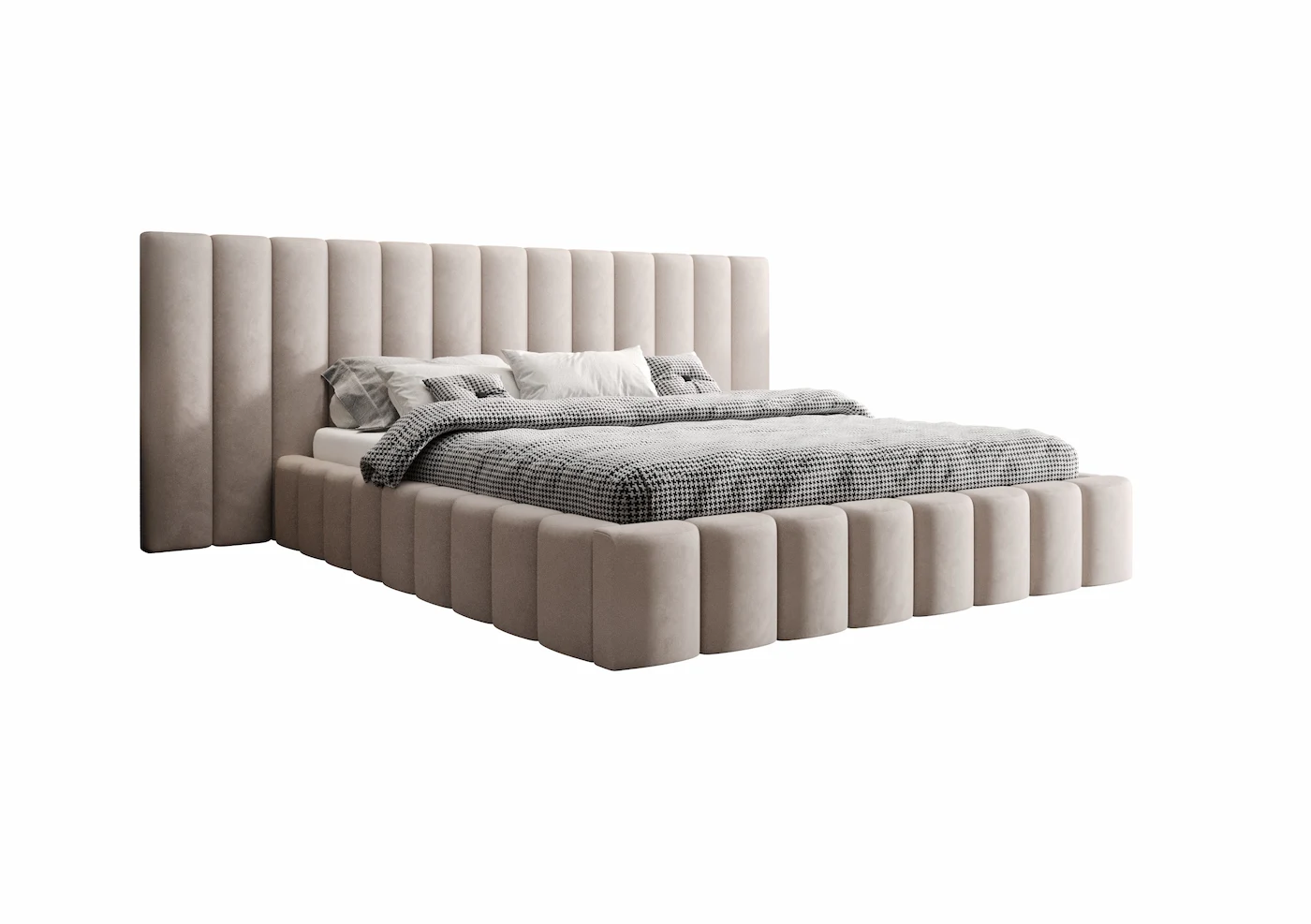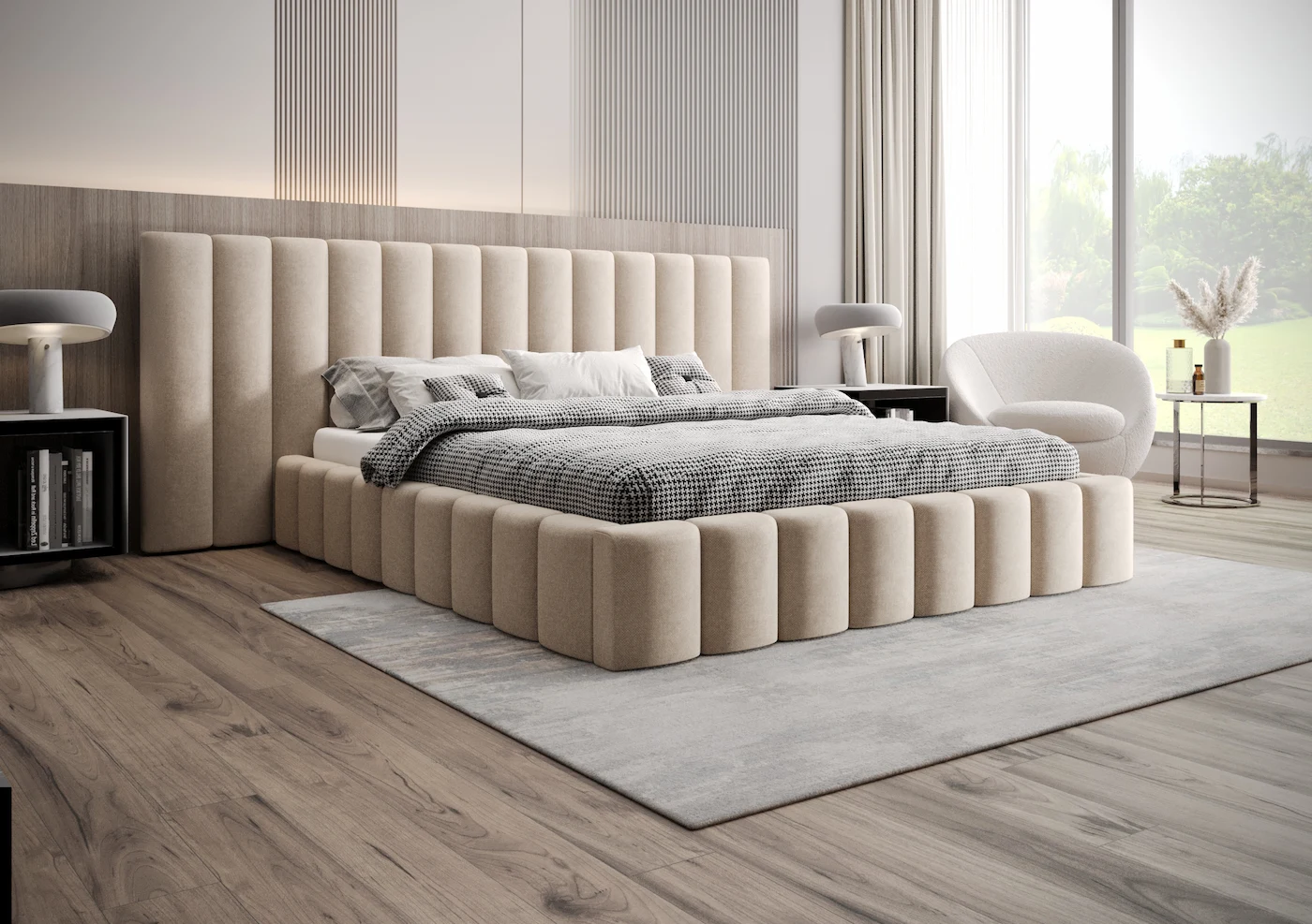 Łóżko tapicerowane 180x200 ADA LUX z pojemnikiem i stelażem długie wezgłowie beżowe welurowe