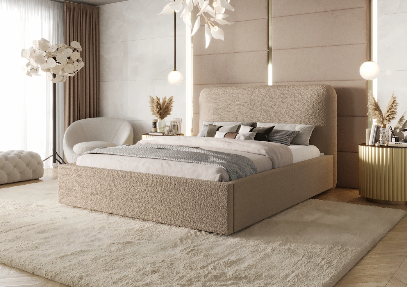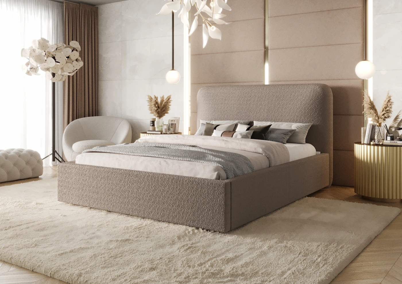 Łóżko Dina może być wykonane w wielu tkaninach, co umożliwia pełną personalizację i idealne dopasowanie do aranżacji wnętrza.