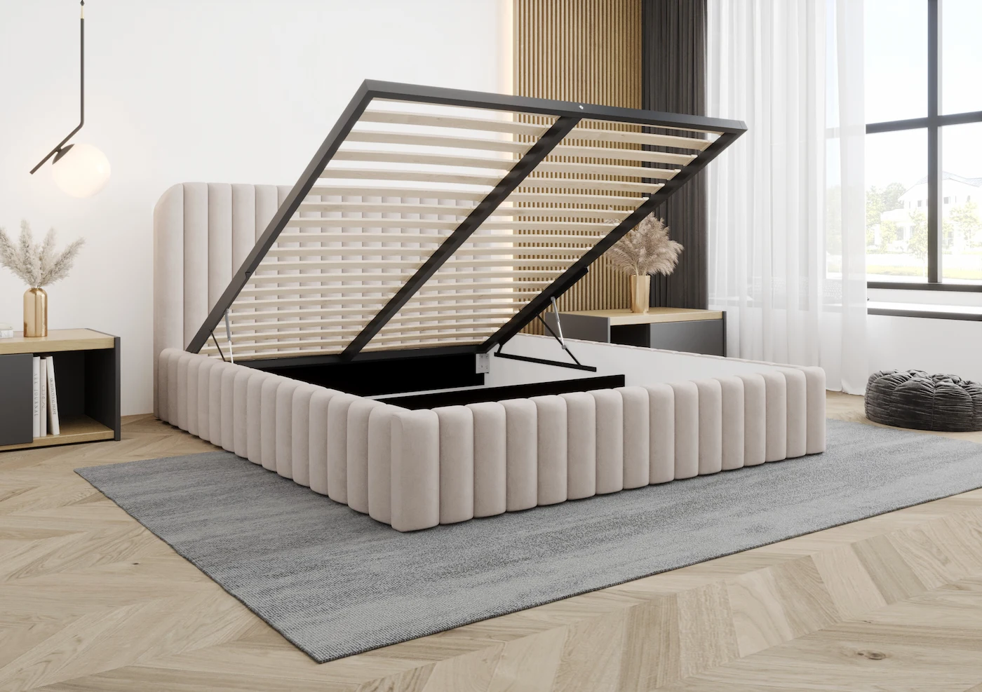 Łóżko tapicerowane 180x200 ENRICO z pojemnikiem i stelażem beżowe tkanina welurowa