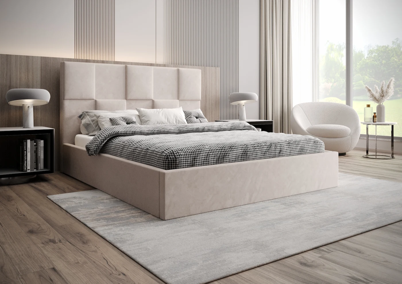 Cechą charakterystyczną modelu Eva jest wielopanelowy zagłówek, który zachwyca wyjątkowym wyglądem i precyzją wykonania. Każdy panel został ręcznie tapicerowany, co nadaje całości niepowtarzalnego charakteru, a zarazem gwarantuje wygodę podczas odpoczynku lub czytania książki. Zagłówek stanowi centralny punkt projektu, dodając elegancji i subtelnego luksusu do każdej przestrzeni.