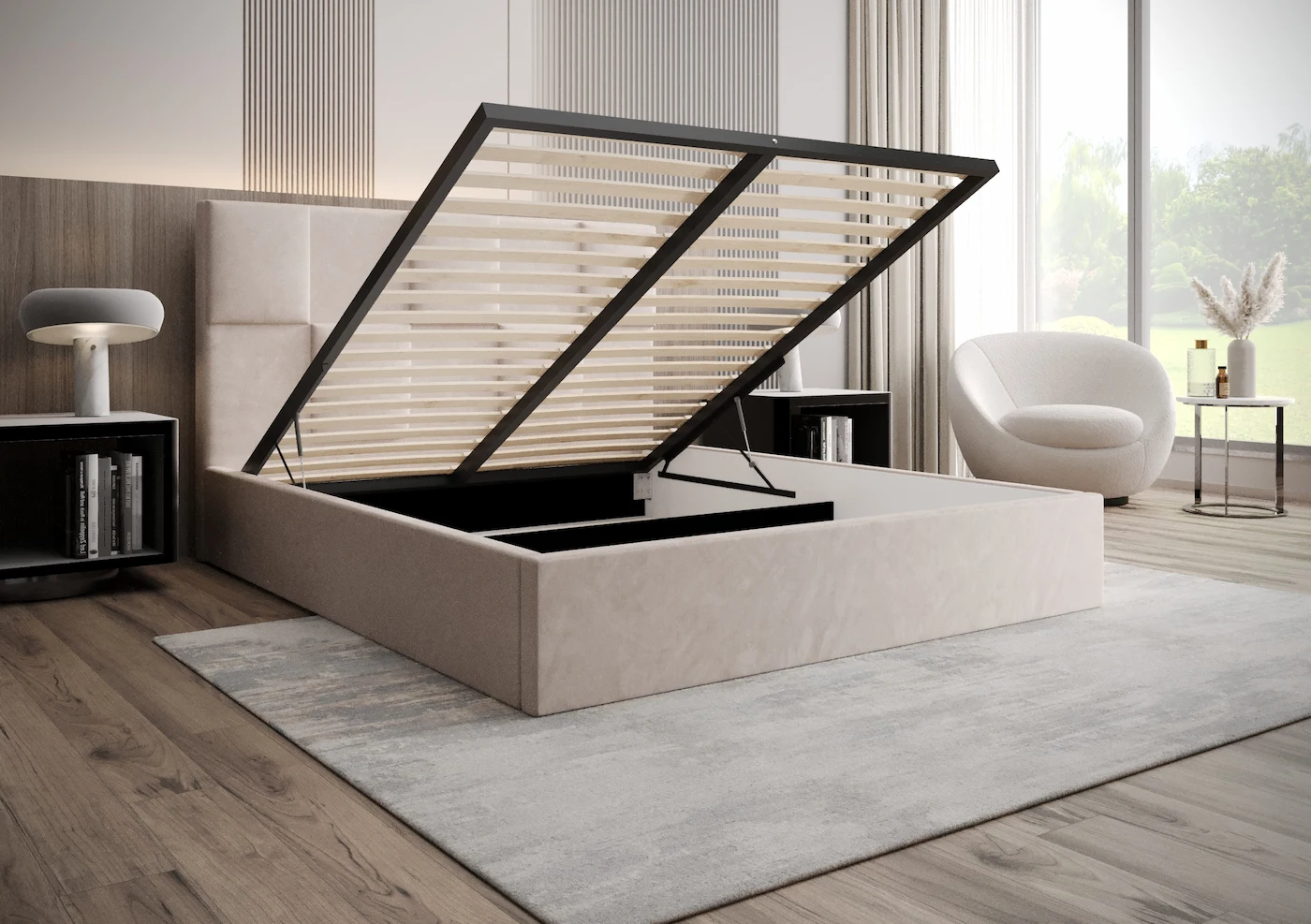 Łóżko tapicerowane 180x200 EVA z pojemnikiem i stelażem beżowe tkanina welurowa