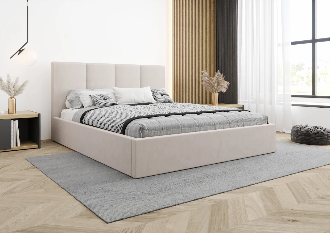 Łóżko tapicerowane 180x200 NELA z pojemnikiem i stelażem beżowe tkanina welurowa