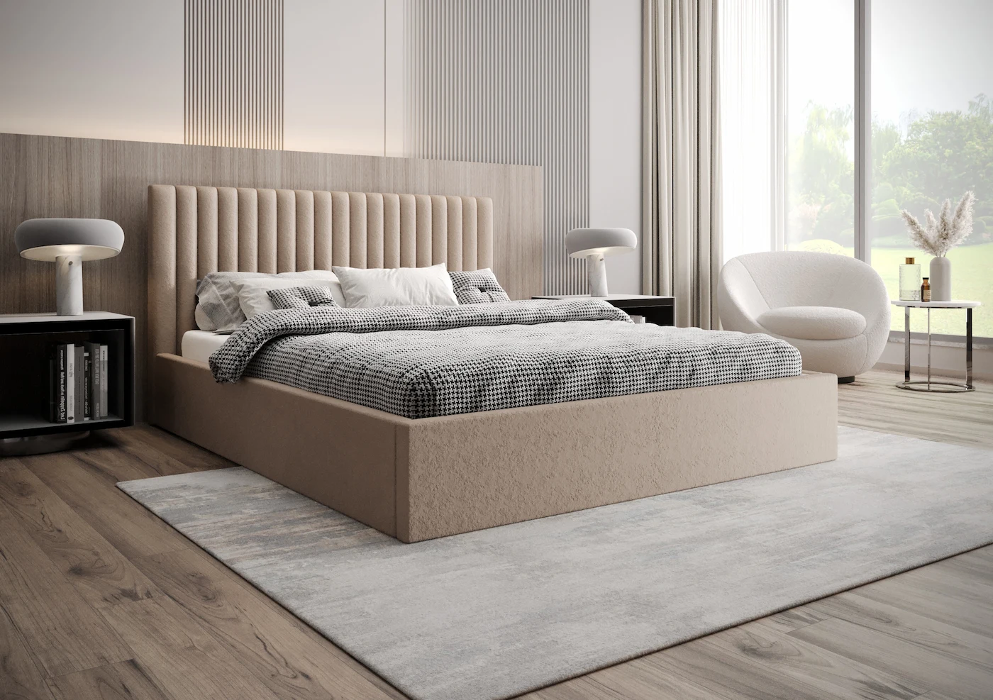 Cechą charakterystyczną modelu Ohio jest tapicerowany panelowy zagłówek, wykonany ręcznie, co nadaje każdemu egzemplarzowi niepowtarzalny charakter i podkreśla jego luksusowy design. Zagłówek nie tylko wyróżnia się nowoczesnym wyglądem, ale także zapewnia komfortowe oparcie podczas wieczornego odpoczynku, czytania książki czy oglądania telewizji.