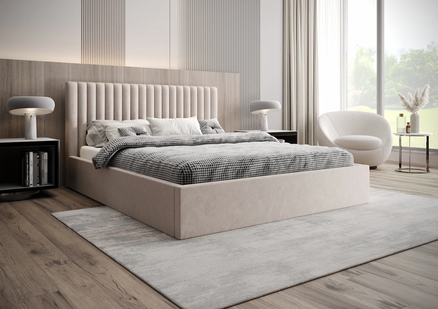 Łóżko tapicerowane 180x200 OHIO z pojemnikiem i stelażem beżowe tkanina welurowa