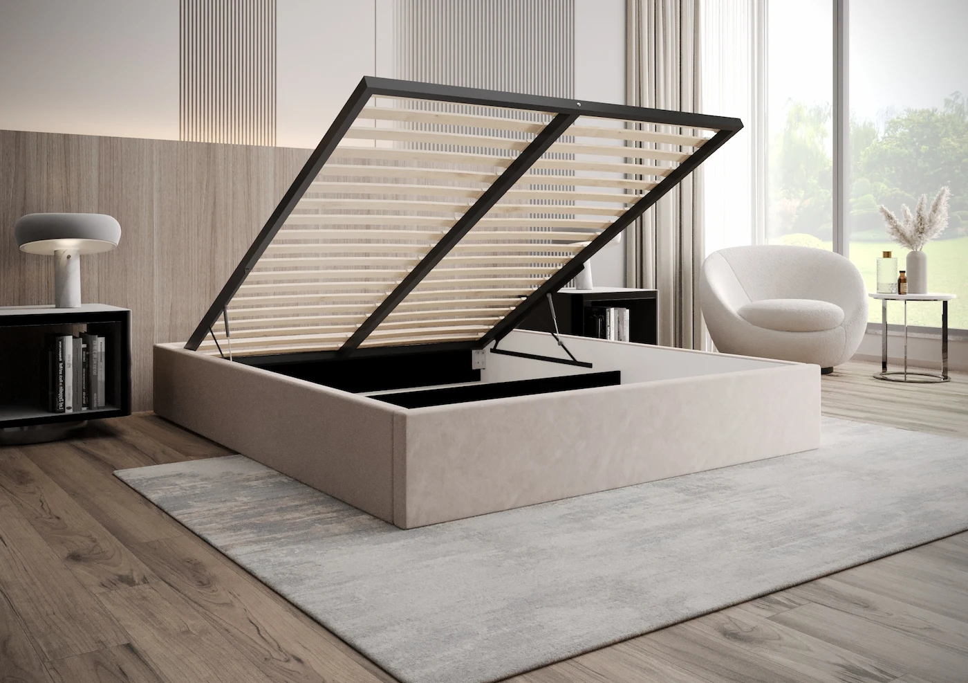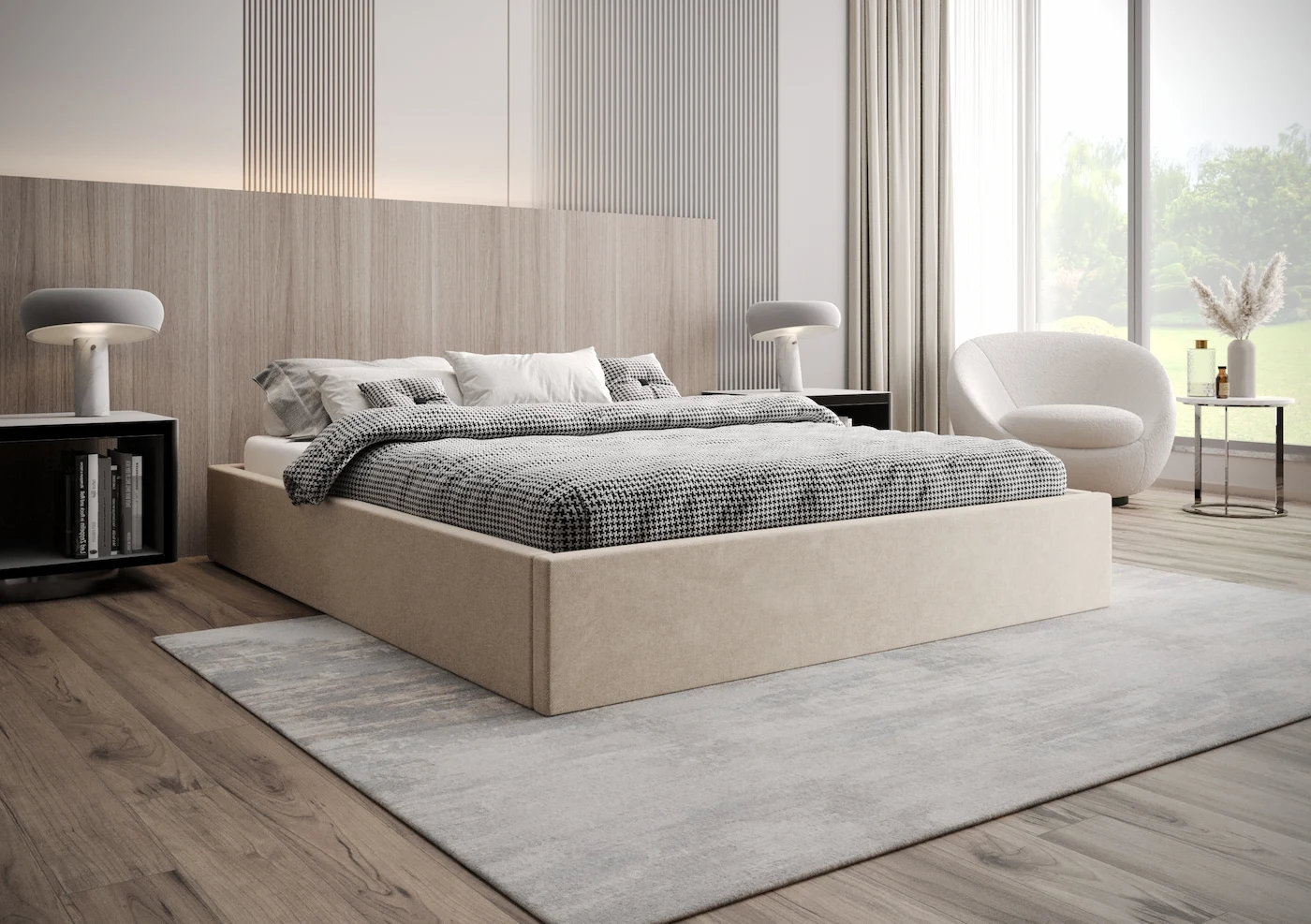 Łóżko tapicerowane 180x200 VIKI z pojemnikiem i stelażem beżowe tkanina welurowa