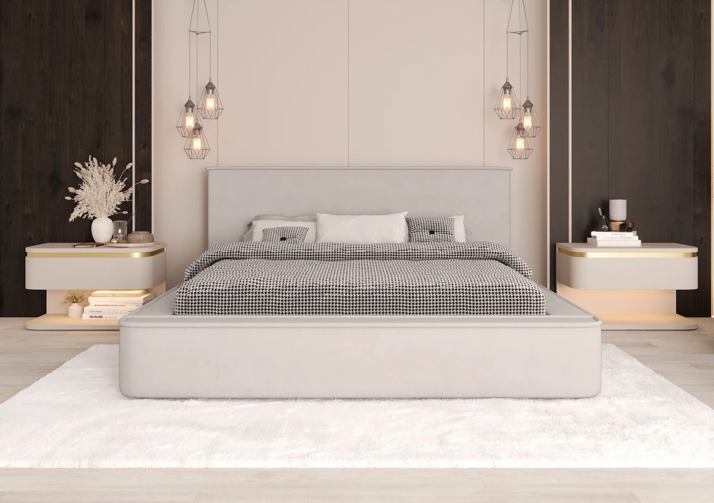 Łóżko tapicerowane 200x200 HOMMIE z pojemnikiem i stelażem beżowe tkanina welurowa