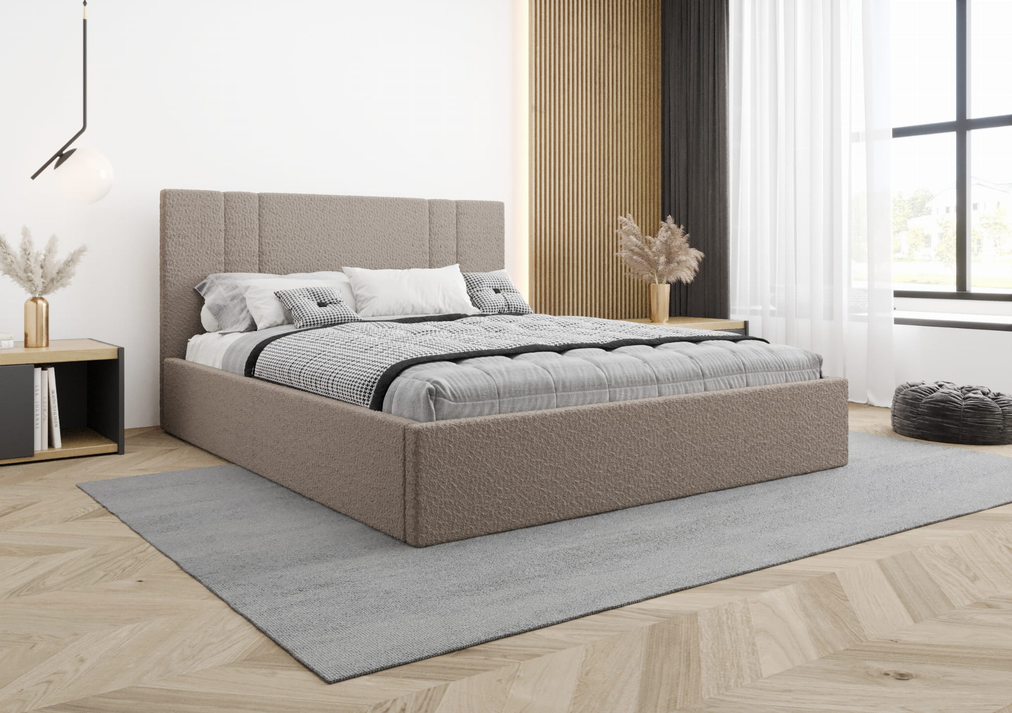 Łóżko tapicerowane 200x200 LISSI z pojemnikiem i stelażem beżowe tkanina welurowa