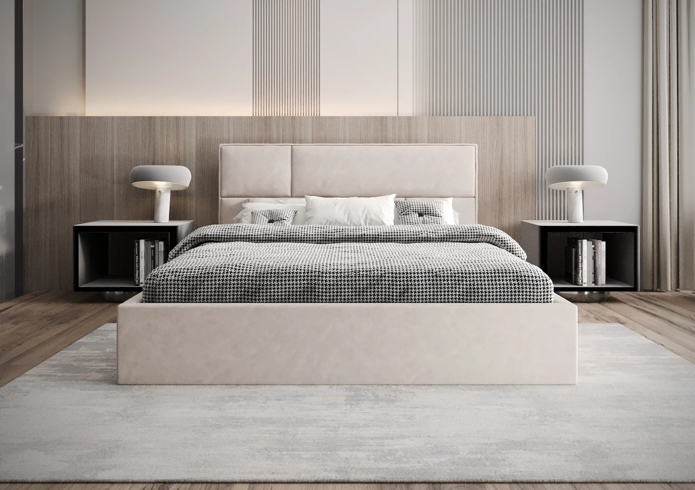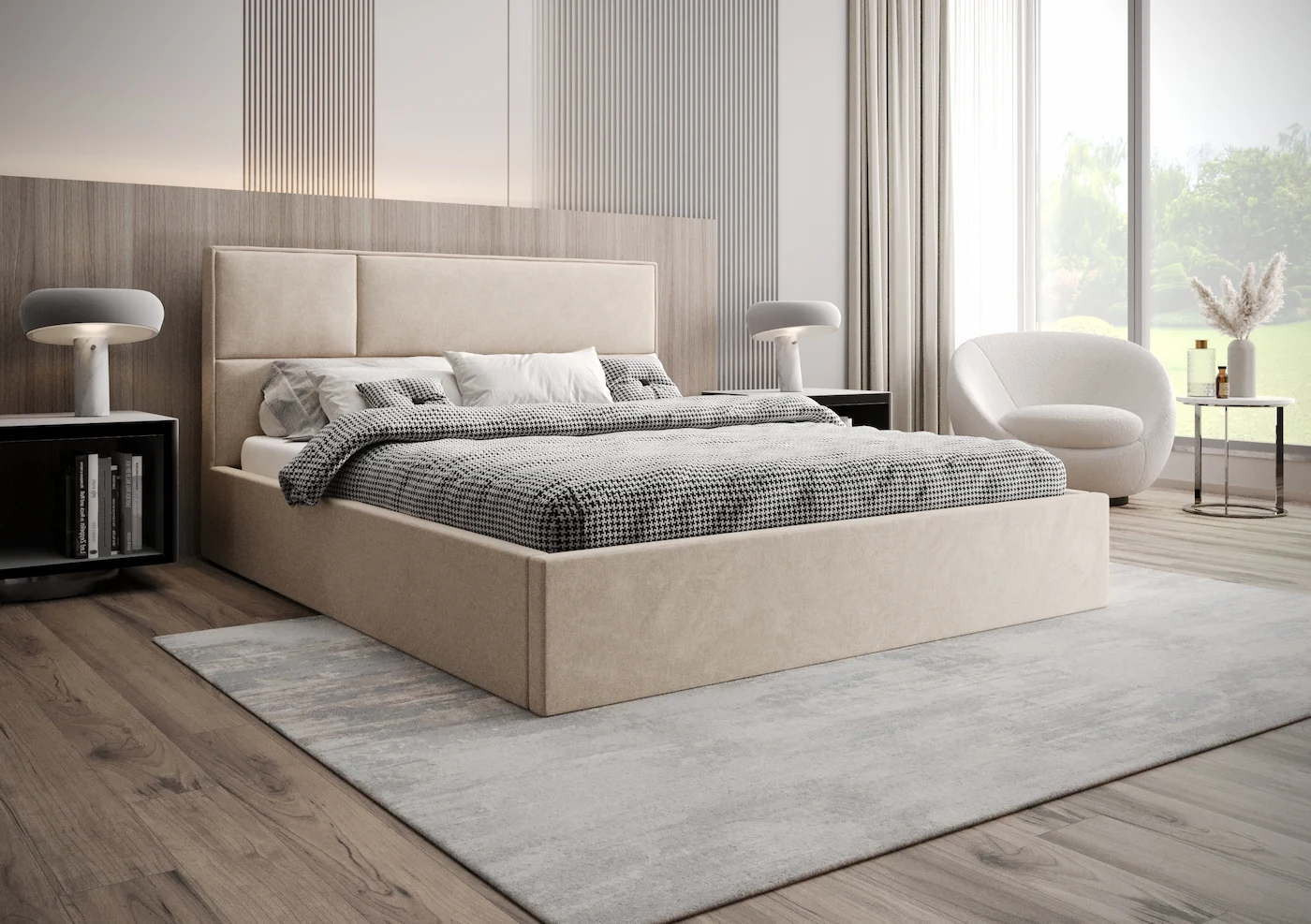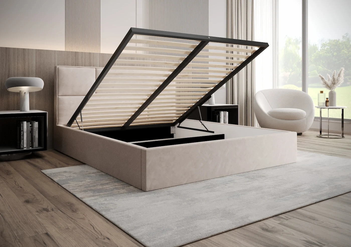 Łóżko tapicerowane 200x200 SELENA z pojemnikiem i stelażem beżowe tkanina welurowa