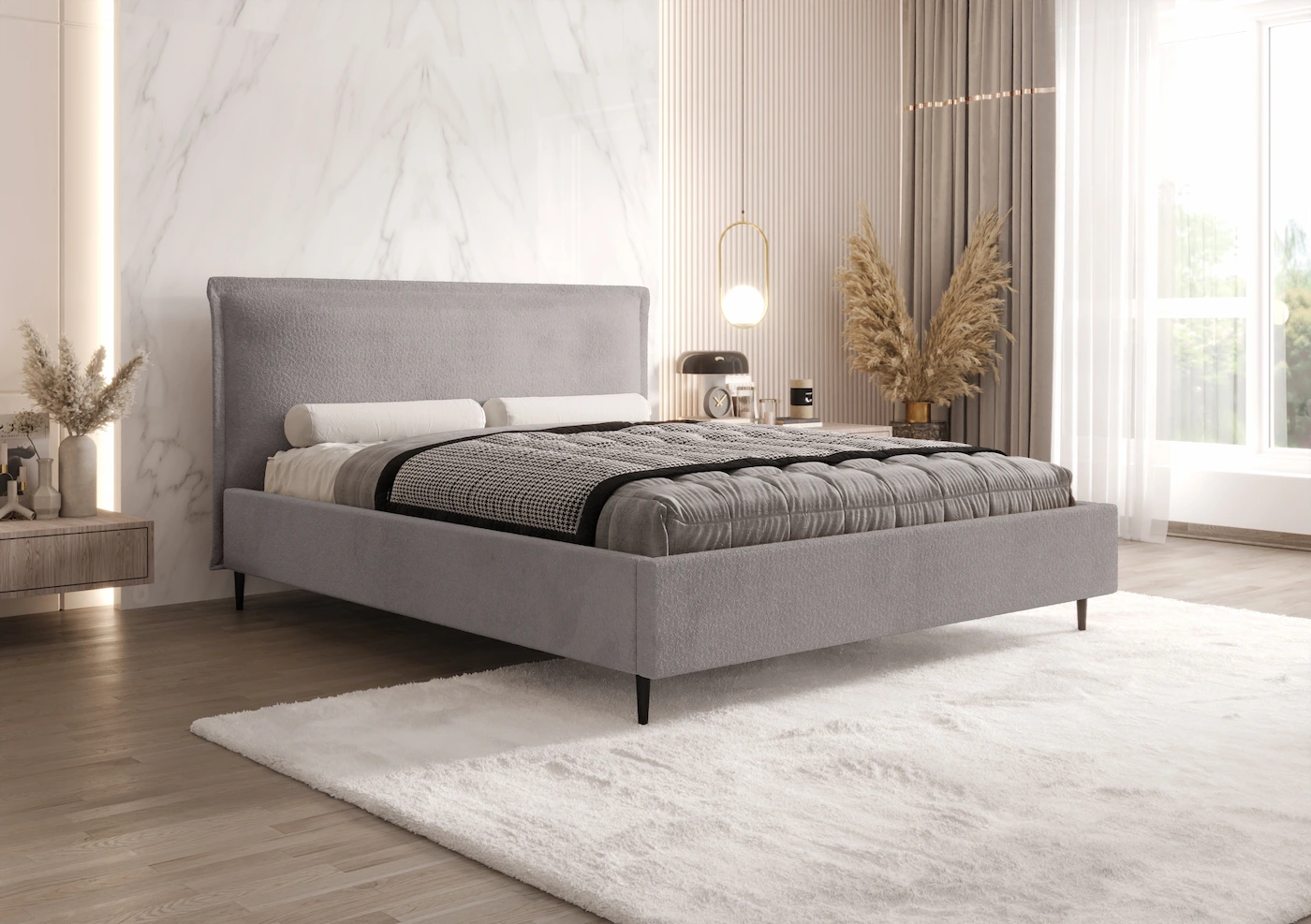 Łóżko tapicerowane 120x200 ELENE to propozycja dla osób, które cenią prostotę, elegancję oraz najwyższy komfort snu. Duża powierzchnia spania 120x200 cm zapewnia wyjątkową wygodę i swobodę, tworząc idealne warunki do codziennego wypoczynku. Dzięki konstrukcji na nogach łóżko prezentuje się lekko i nowocześnie, doskonale komponując się zarówno z minimalistycznymi, jak i bardziej klasycznymi aranżacjami sypialni.