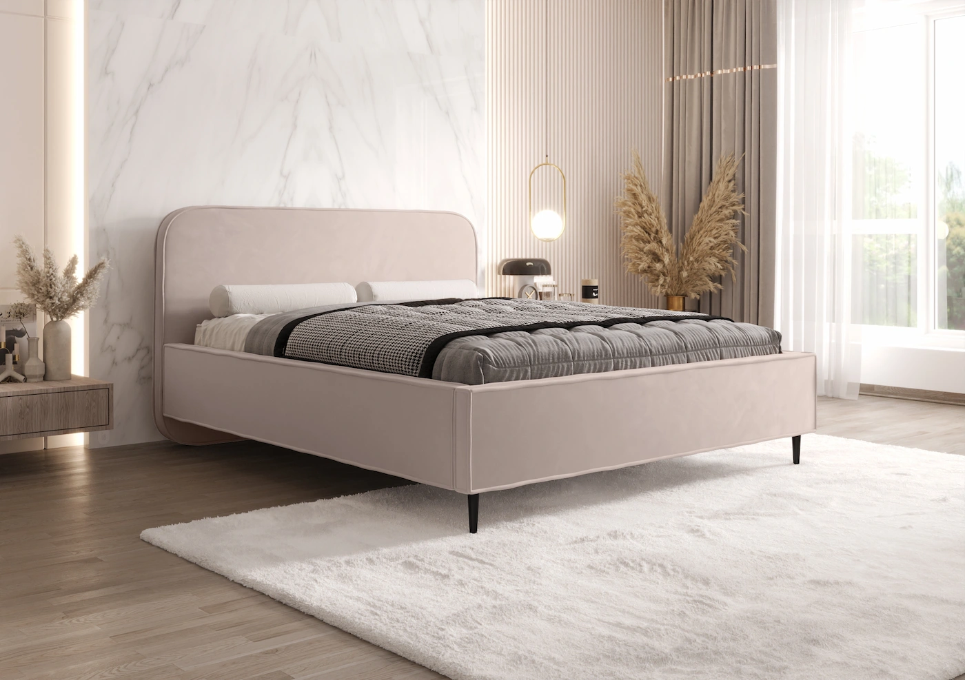 Łóżko LEONI wyróżnia się zaobloną, smukłą konstrukcją, która nadaje mu elegancki i nowoczesny wygląd. Delikatne linie oraz harmonijna forma sprawiają, że łóżko prezentuje się stylowo i wprowadza do sypialni spokojną, przyjemną atmosferę.