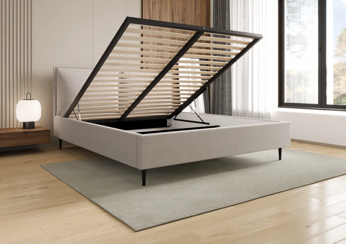 Łóżko FANCY wyposażono w praktyczny pojemnik na pościel, idealny do przechowywania dodatkowych tekstyliów, takich jak poduszki czy kołdry. Dzięki temu łóżko nie tylko wygląda stylowo, ale również pomaga w utrzymaniu porządku w sypialni.