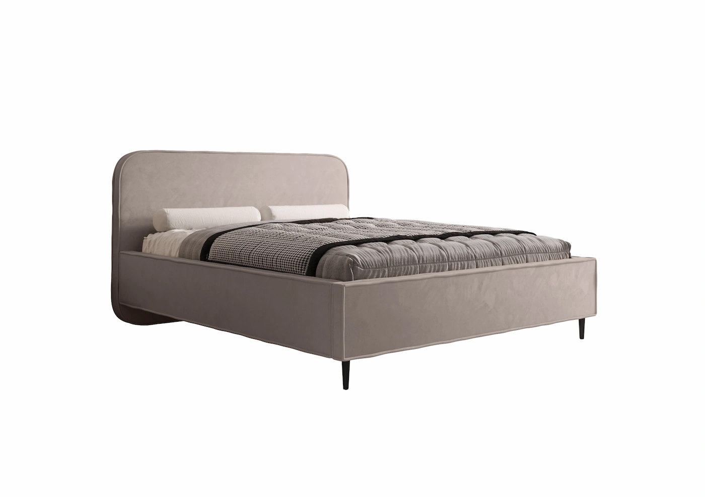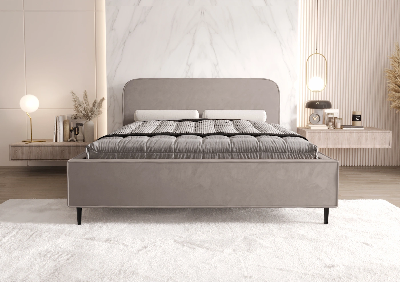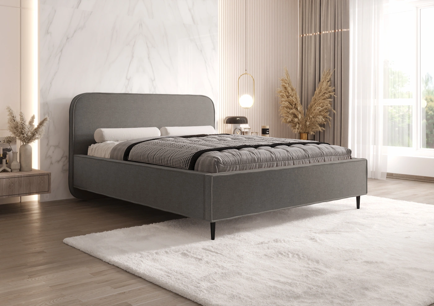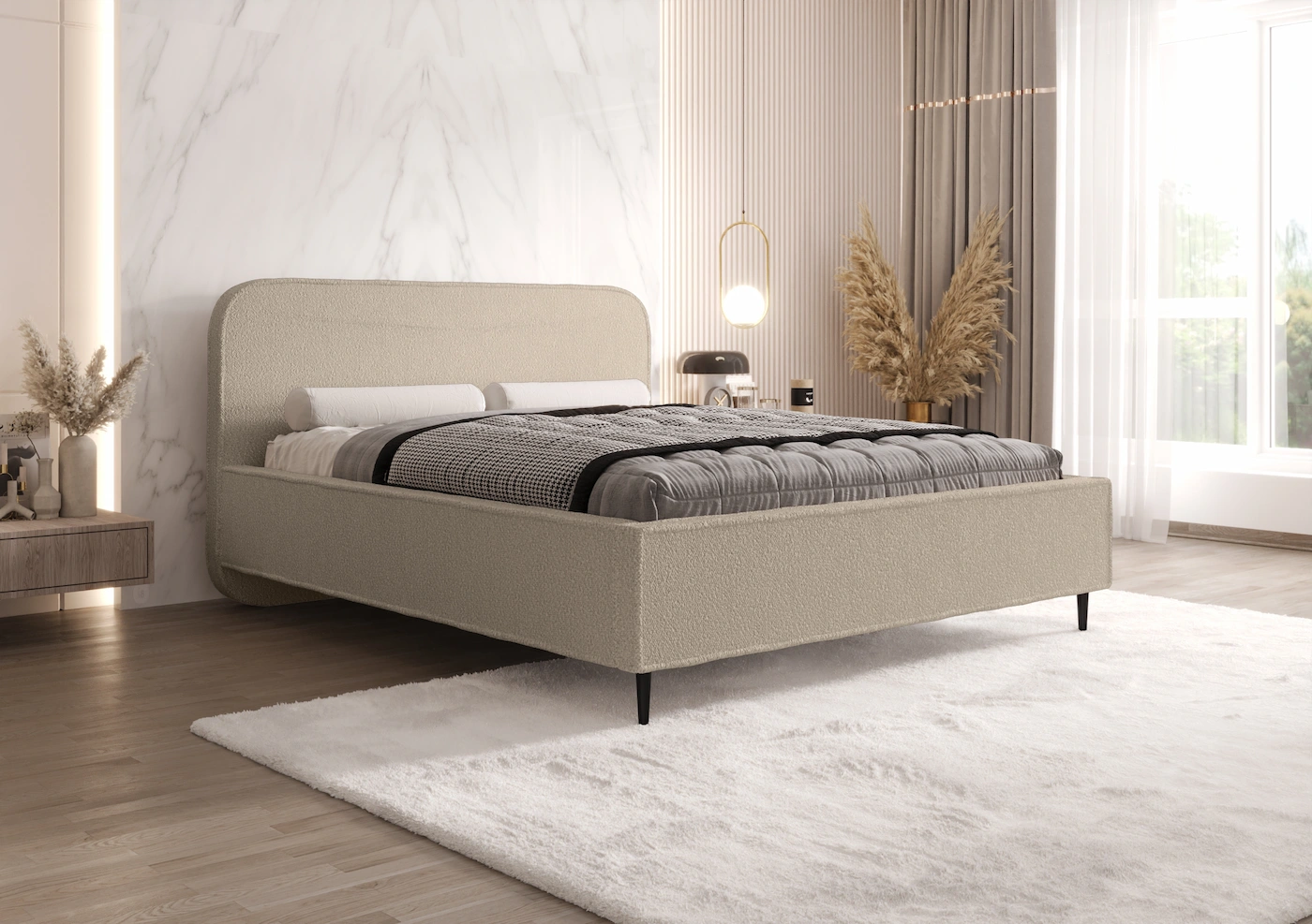 Łóżko LEONI wyróżnia się zaobloną, smukłą konstrukcją, która nadaje mu elegancki i nowoczesny wygląd. Delikatne linie oraz harmonijna forma sprawiają, że łóżko prezentuje się stylowo i wprowadza do sypialni spokojną, przyjemną atmosferę.